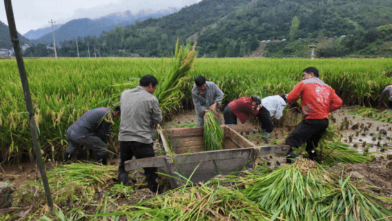 竹溪县中峰镇万亩稻田披上金黄盛装,收割机开足马力,往复穿梭,收割、脱粒、装车一气呵成。