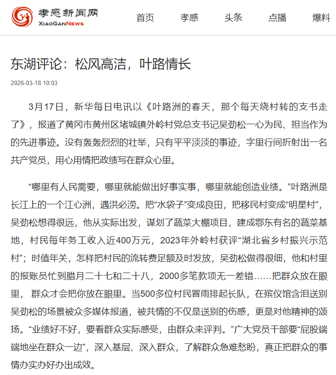 3月17日,新华每日电讯以《新华每日电讯 新华网| 叶路洲的春天,那个每天绕村转的支书走了》,报道了黄冈市黄州区堵城镇外岭村党总支书记吴劲松一心为民、担当作为的先进事迹。没有轰轰烈烈的壮举,只有平平淡淡的事迹,字里行间折射出一名共产党员,用心用情把政绩写在群众心里。