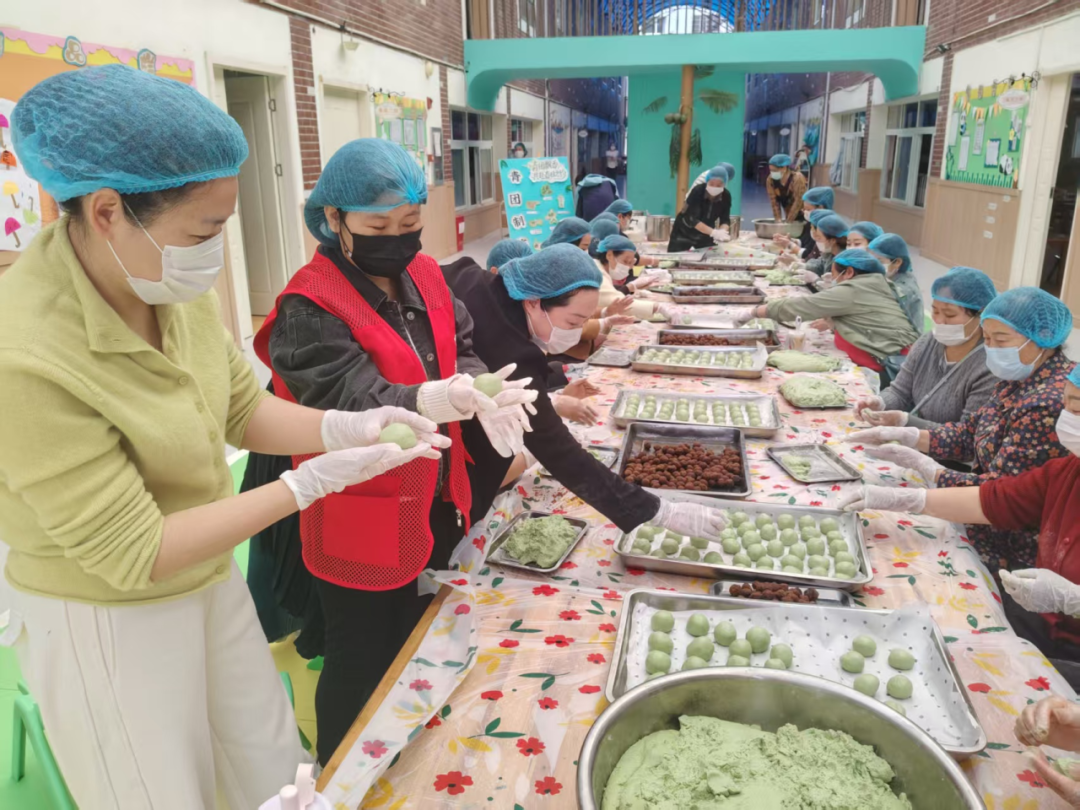随后,受邀参与活动的家长们有序进入活动场地,开启青团手工制作环节。幼儿园提前备好新鲜糯米粉、清香艾草汁、香甜软糯的各式馅料等食材,为家长们的制作提供了充足保障。家长们两两结伴、分工协作,全身心投入到青团制作中:揉面团、压面皮、包馅料,再轻轻收拢面皮、慢慢搓圆成型,指尖翻飞间,一个个圆润饱满、翠绿可爱的青团陆续做好,整齐摆放在餐盘里。