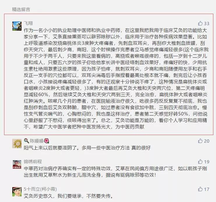 《健康湖北》微信公号这篇文章,目前获得了5.7万人阅读。后台留言网友纷纷用亲身实例,对用艾叶烟熏和艾灸疗法,予以了支持和响应。