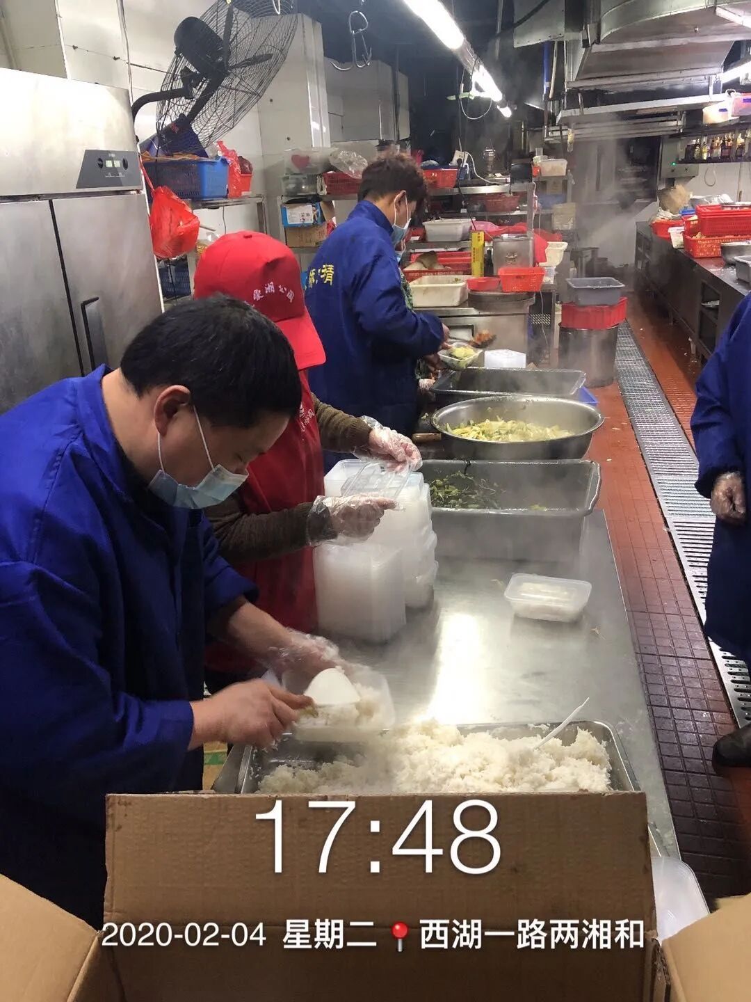 黄州虾先生两湘和餐厅董事长 钟鹏:初一我是在家里做的,马上就给他送出去了。然后下午不停的接电话,有很多电话,主要是医护人员吃饭不方便。我们立马组织黄州的几个员工,成立了这个厨房,在家里做的话量肯定不够。