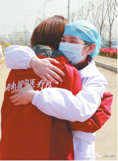 3月18日,在大别山区域医疗中心广场上,建立了深厚情意的黄冈市中心医院医生和湖南援黄医疗队医生依依惜别。 记者 余涛 摄