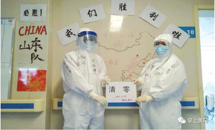 黄冈大别山区域医疗中心实现“四类人员”清零,山东医疗队两名医生手持“清零”牌庆祝。本报通讯员 摄
