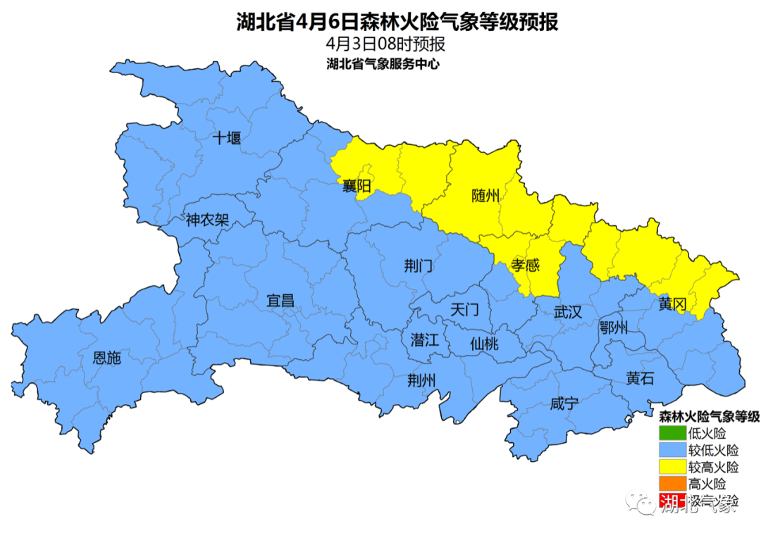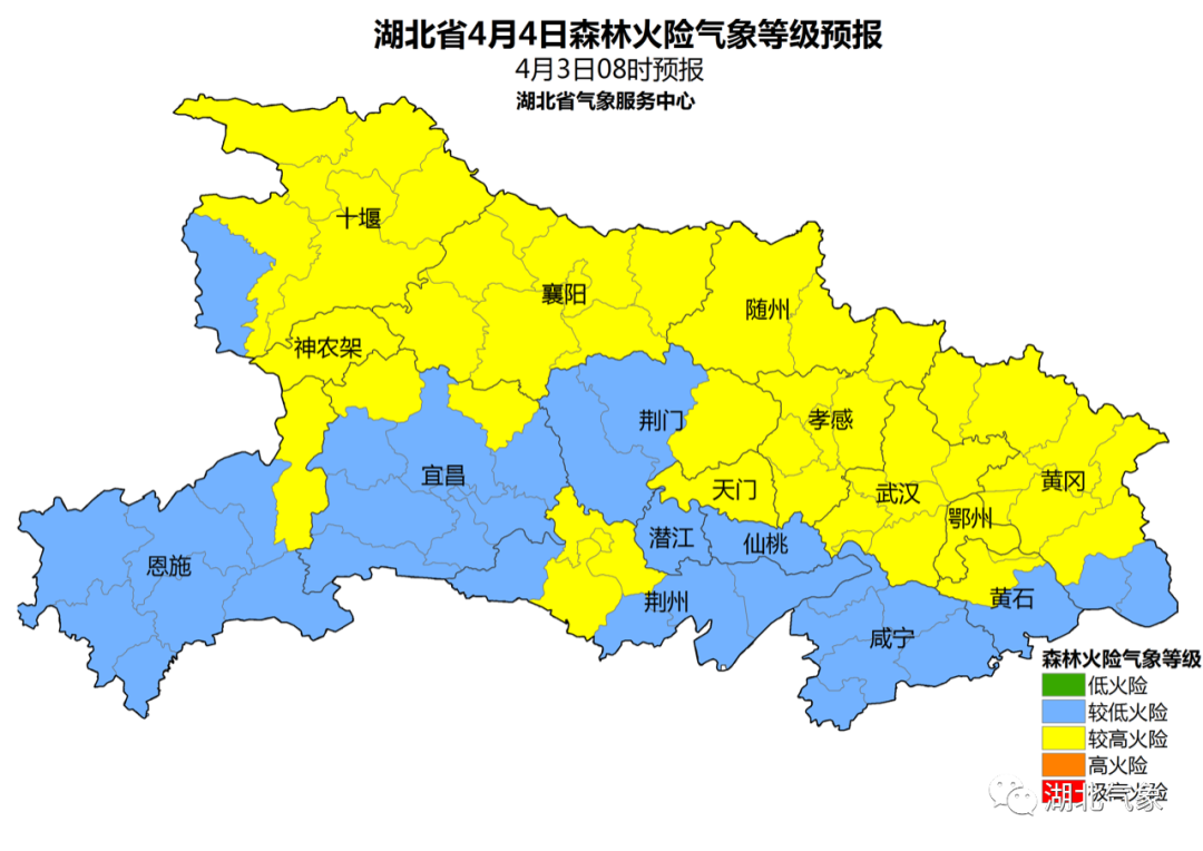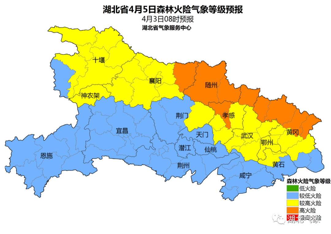 © 4月4日:全省多云到阴天,恩施地区阴天有小雨。最高气温大部地区17~20℃;最低气温大部地区9~12℃。偏北风2~3级。