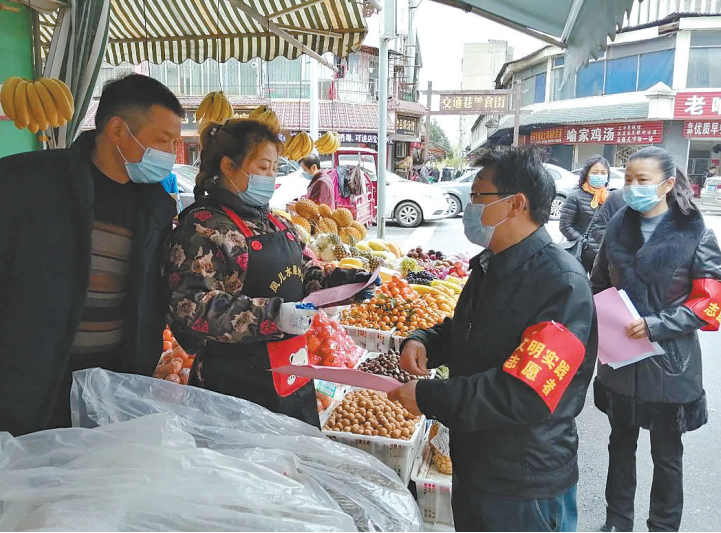 4月11日,清源门社区各联系单位和社区干部,开展了爱国卫生活动。图为工作人员到壕沟路市场,向商户发放“双创”和疫情防控宣传单的情景。通讯员 刘琛 摄