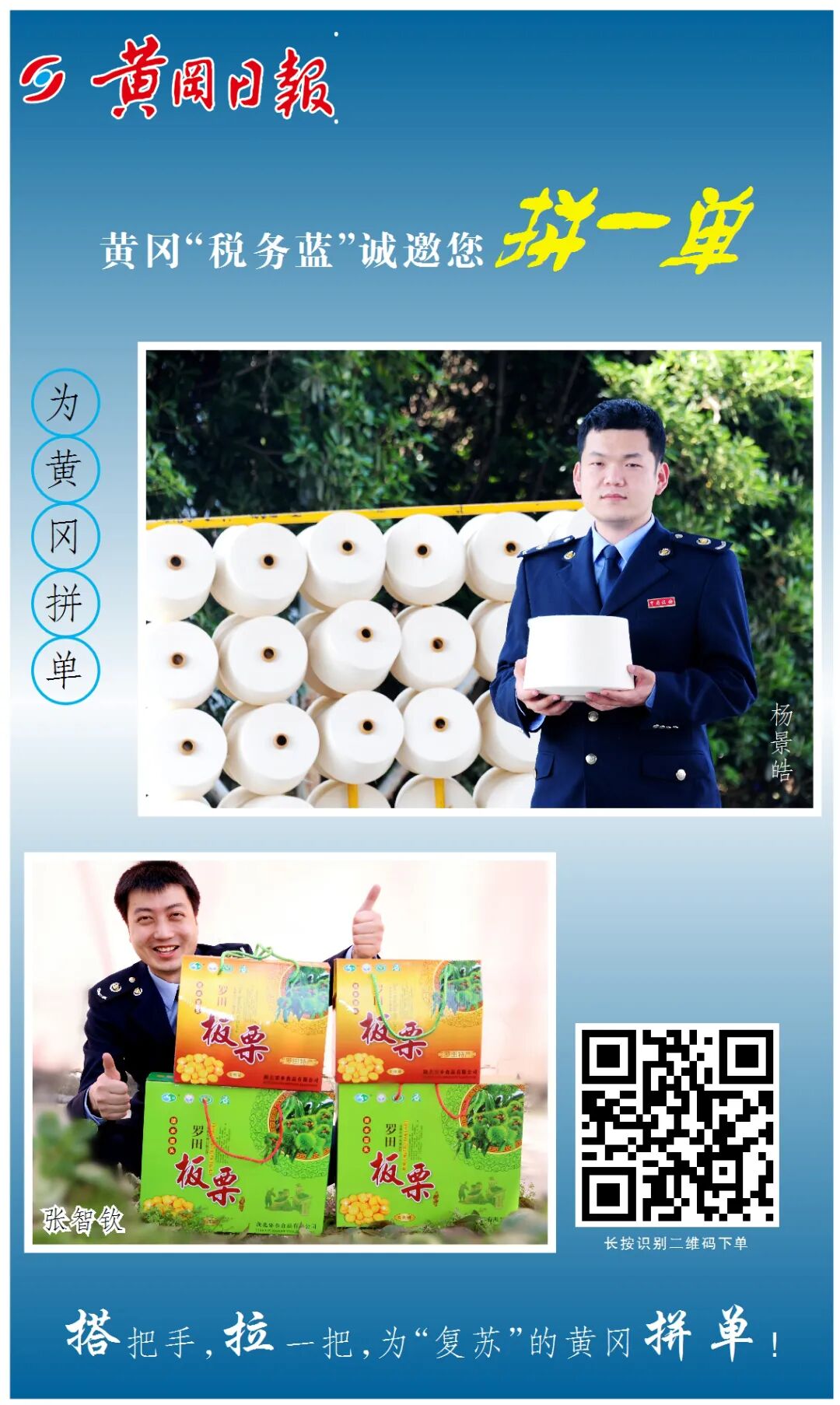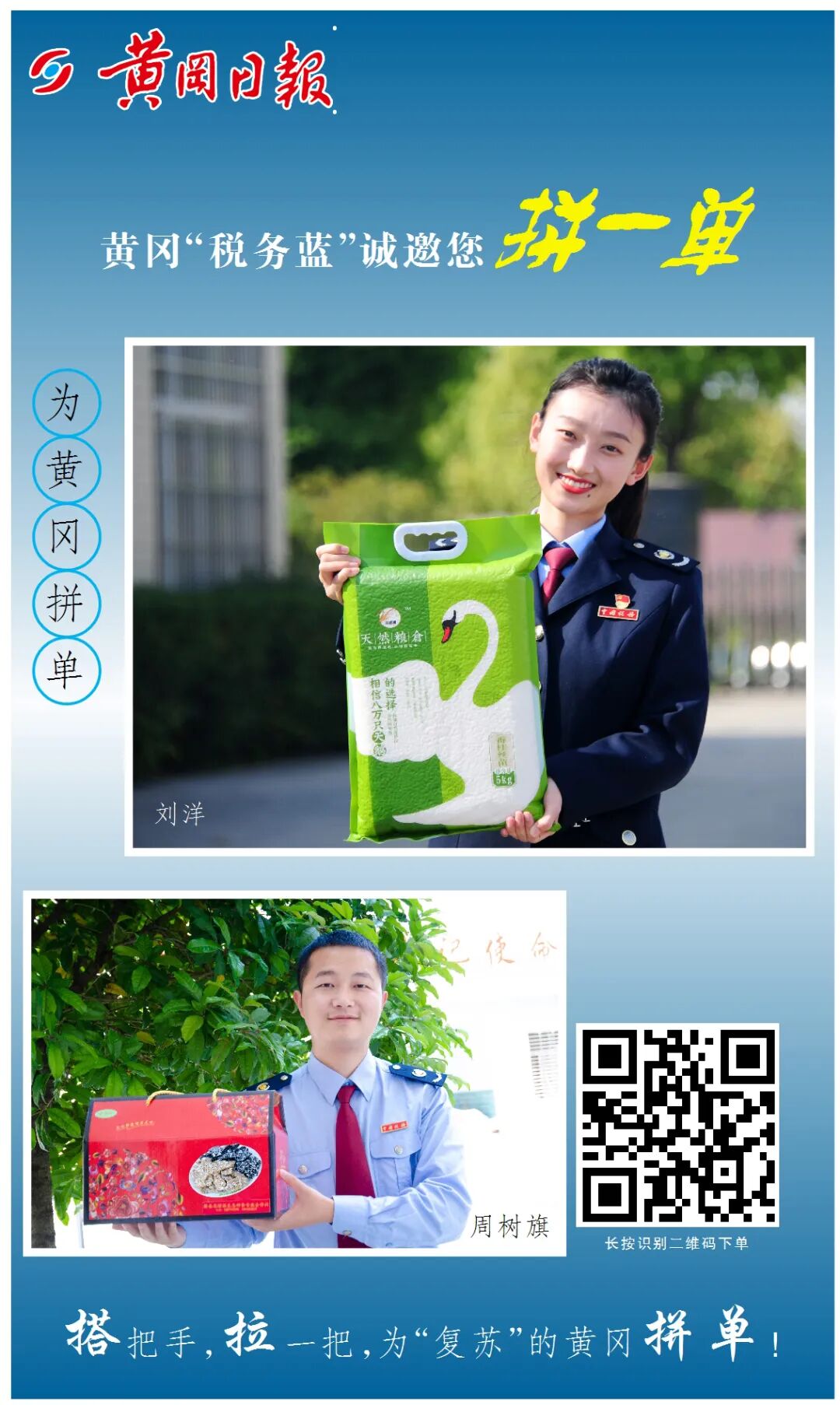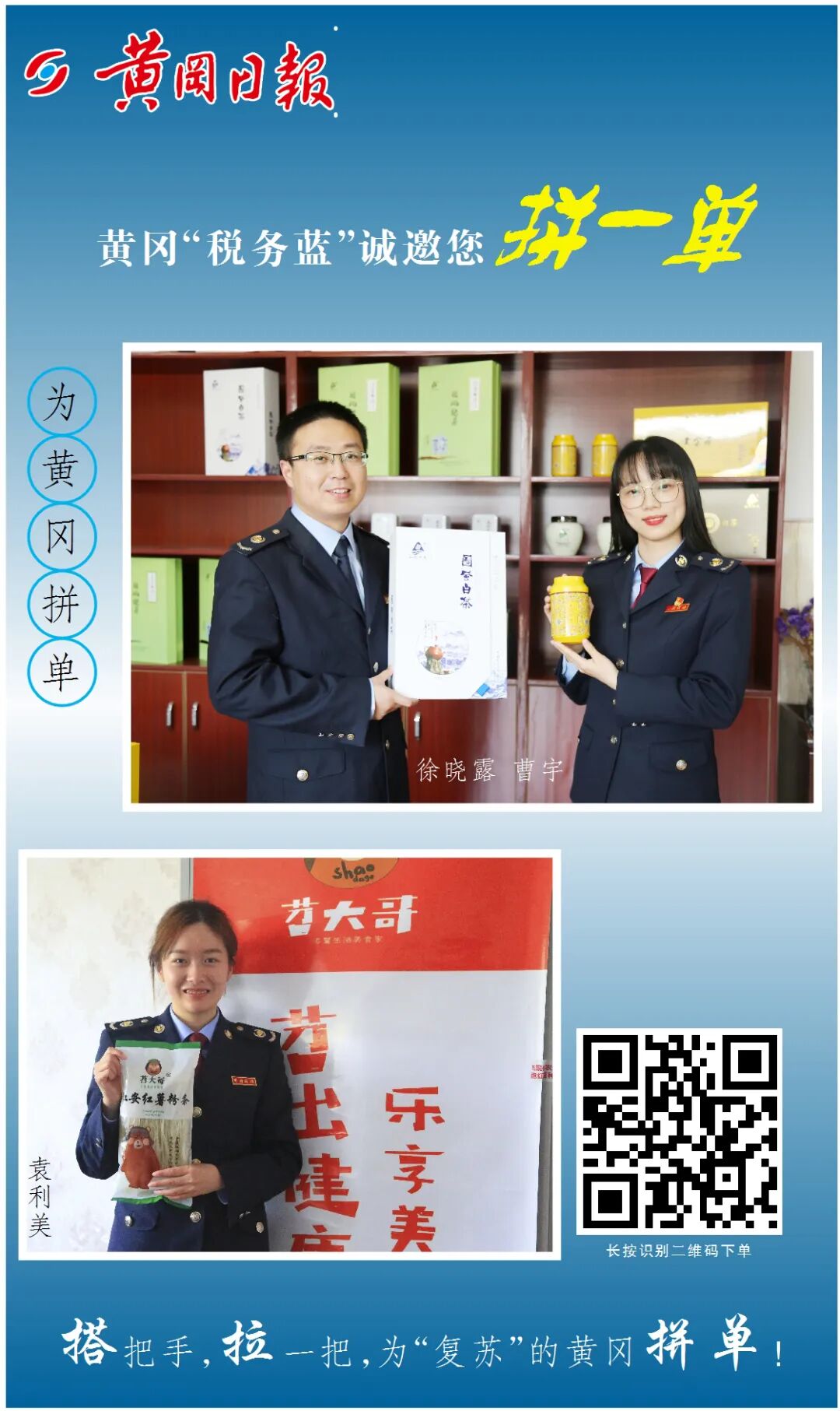 在第29个全国税收宣传月到来之际 黄冈税务青年为黄冈倾情代言 全力推销大别山特色产品 帮助企业纾难解困 助力黄冈决战脱贫攻坚 黄冈“税务蓝” 诚邀您为黄冈拼一单 品质杠杠滴,买它买它买它 搭把手 拉一把 为“复苏”的黄冈拼单吧 您的每一单都是爱的传递 责编:区融媒体中心 舒娅彤