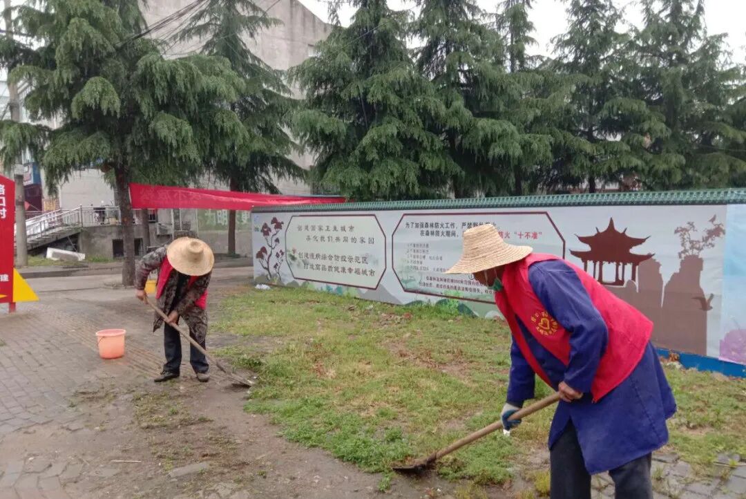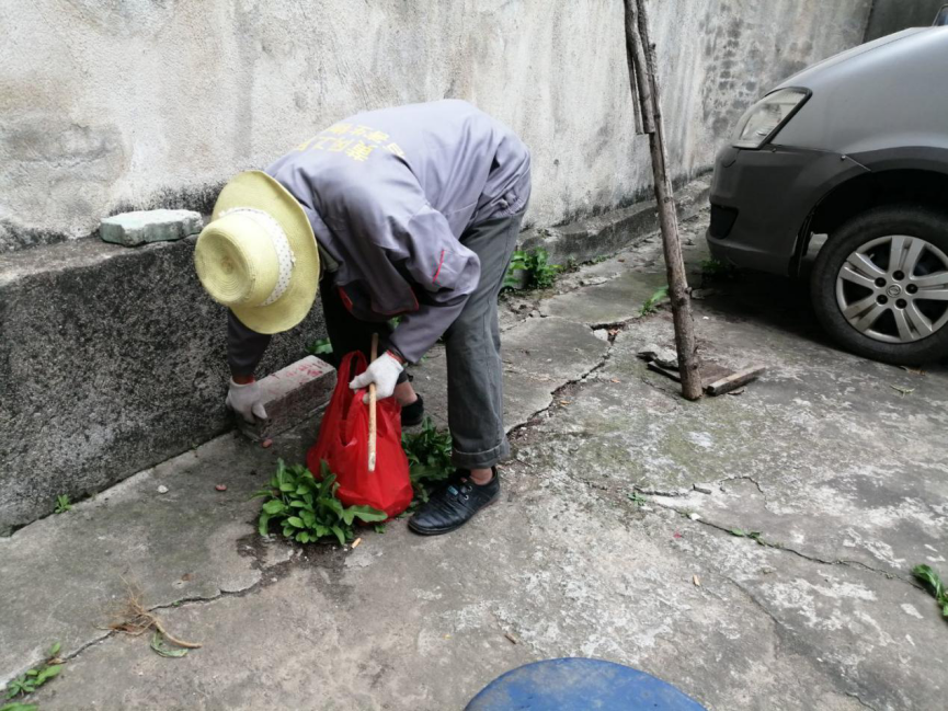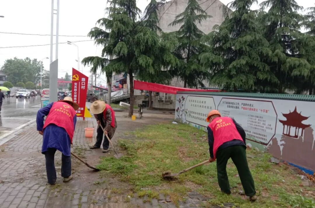 路口镇路口村生态环保志愿服务队清理街道垃圾和乱贴乱画小广告,并铲除道路两旁的杂草