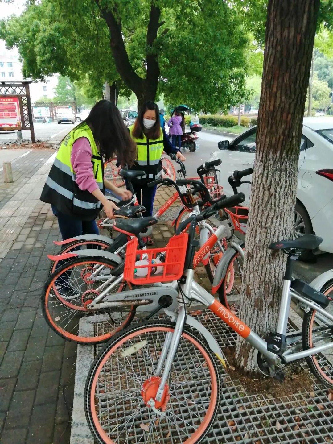 4月20日,虹桥社区工作人员规整街面共享单车停放