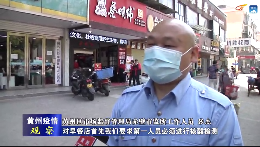 黄州区市场监督管理局赤壁市监所工作人员 张杰: 对早餐店首先我们要求第一人员必须进行核酸检测;第二必须有健康证,食品经营许可证以及工商营业执照,再一个早餐店进店就餐的人员我们要求首先第一消毒 ;第二查体温并倡导记录一下,再就是进店之后要求隔位就餐,按室内面积和人员人数,有一个10:1左右的比例。