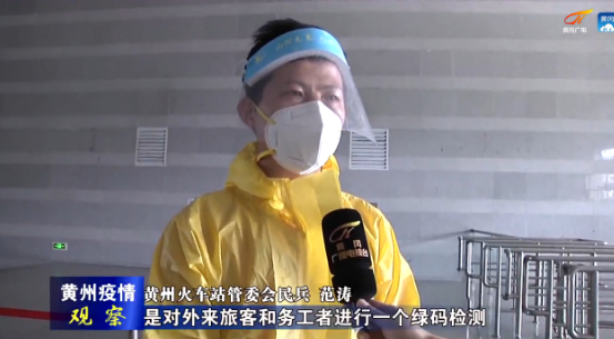 【黄州火车站管委会民兵 范涛】我们在这里做疫情防控,必须对外来旅客和务工者进行一个绿码检测,就是检查他的健康码;其次是引导旅客和外地输入过来的人员扫描行程码,这个行程码的作用是防境外输入和查看14天以内去过哪些地方,有没有重灾区、疫情区的人员,如果这些都正常了,就进行第三个步骤--体温检测,体温正常了我们就给予放行。
