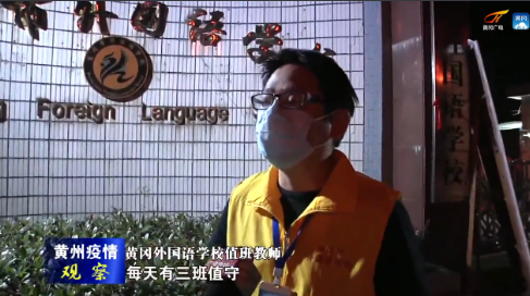 黄冈外国语学校值班教师:我们是根据学校的安排,每天有三班值守,早上7:30-11:30,5个小时,中午是12:30-5:30分,第三班是17:30-22:30,轮番值守,第一周每一天两个人值守,志愿者报名,党员优先。我们主要的工作就是配合学校的门卫,如果有家长给孩子送物品的话,由我们代为传递。