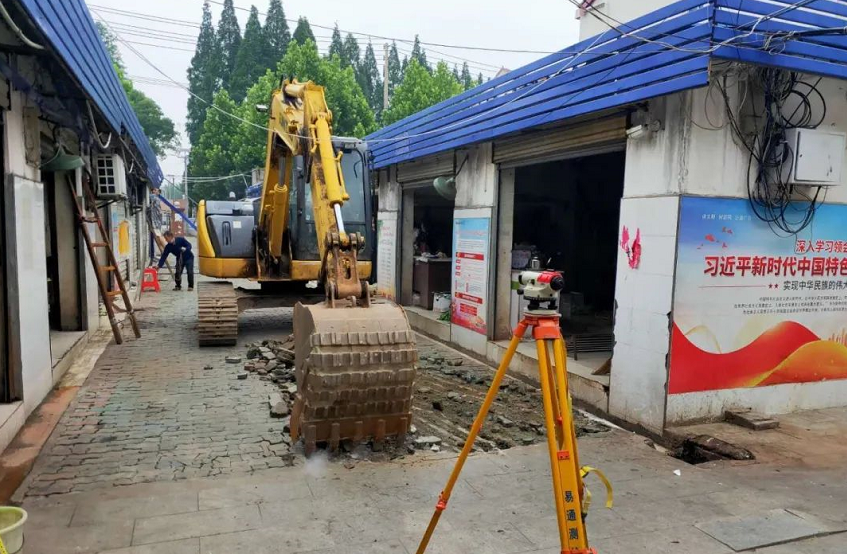 ▲南湖街道桃园街社区集贸市场使用大型机械对集贸市场下水道进行挖掘改造,并组织人员拆除商铺两边店眉