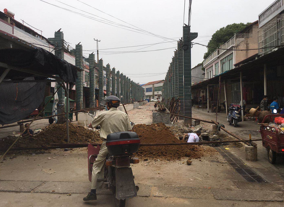 ▲路口镇鑫龙集贸市场工人正在进行施工
