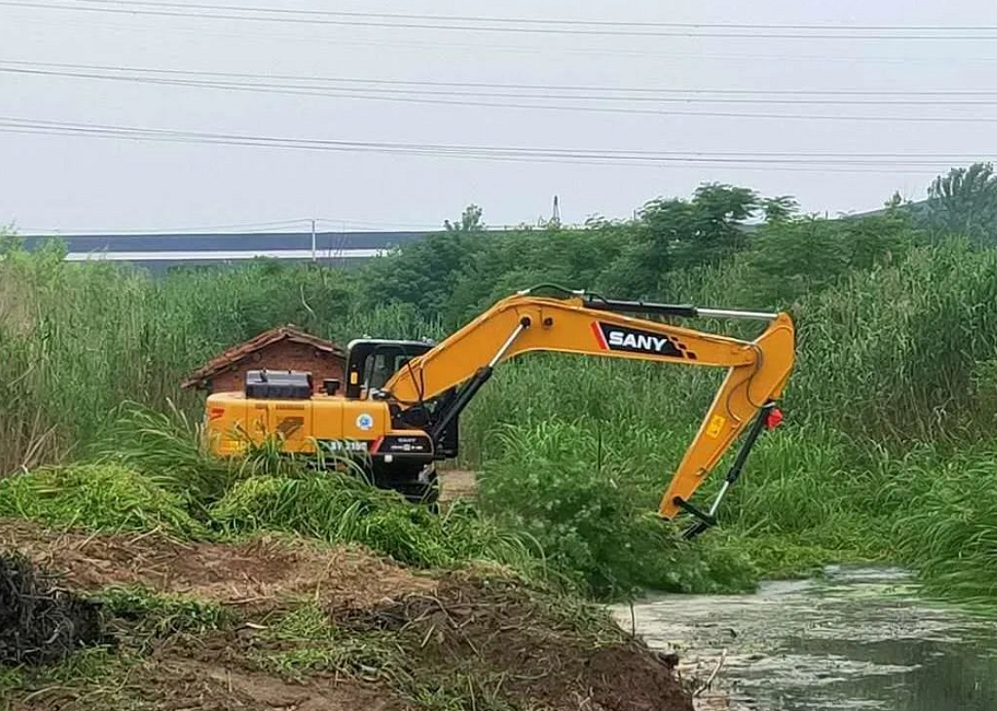 ▲南湖街道榨舟街社区使用机械清理二队防汛港杂草杂物