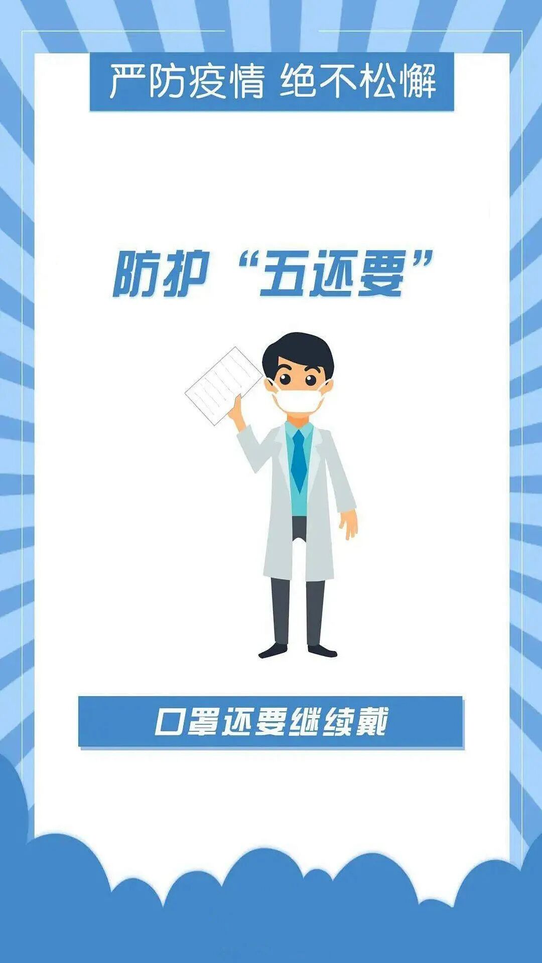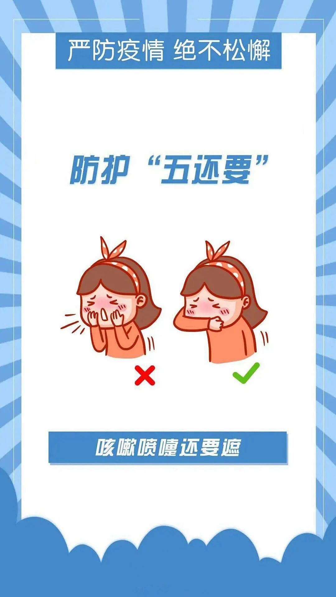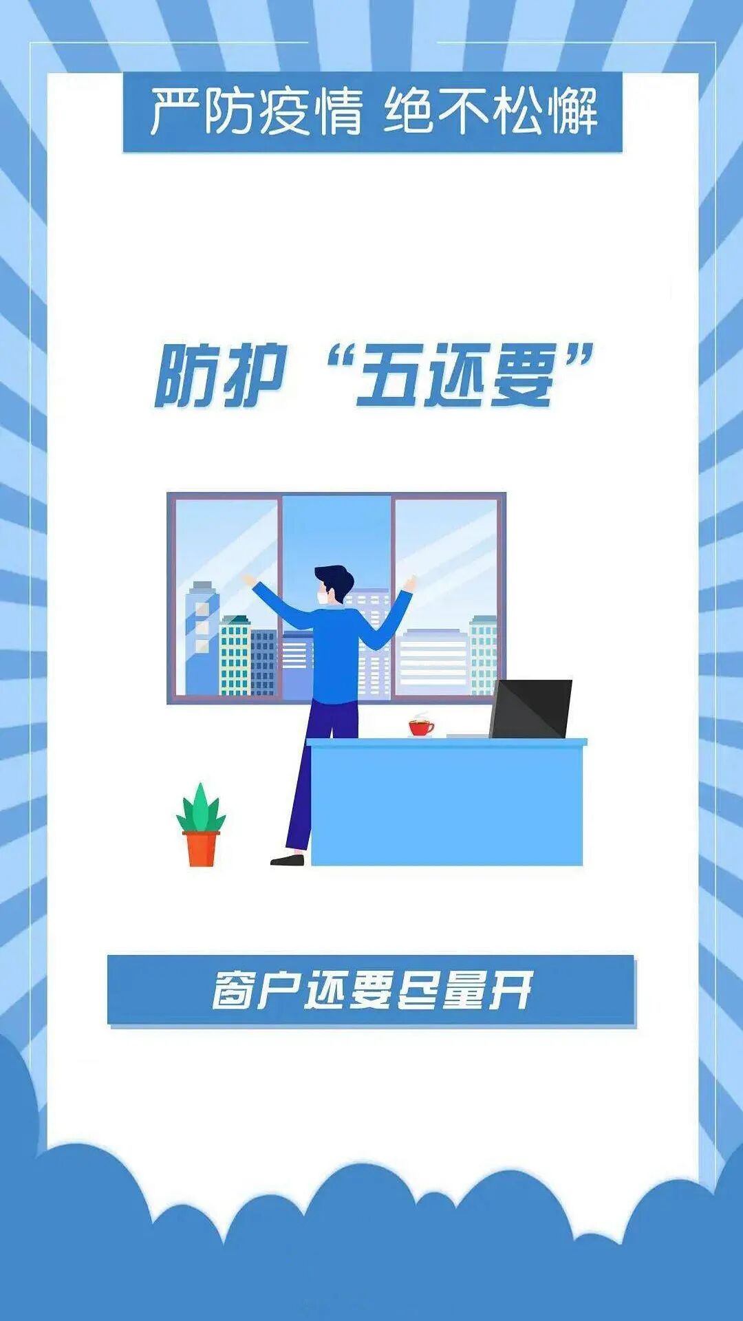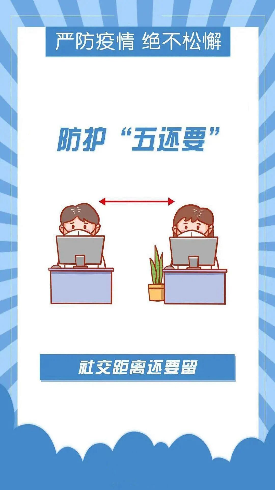 “五还要”:口罩还要戴,社交距离还要留,咳嗽喷嚏还要遮,而且双手还得经常洗,门窗还得尽量开。