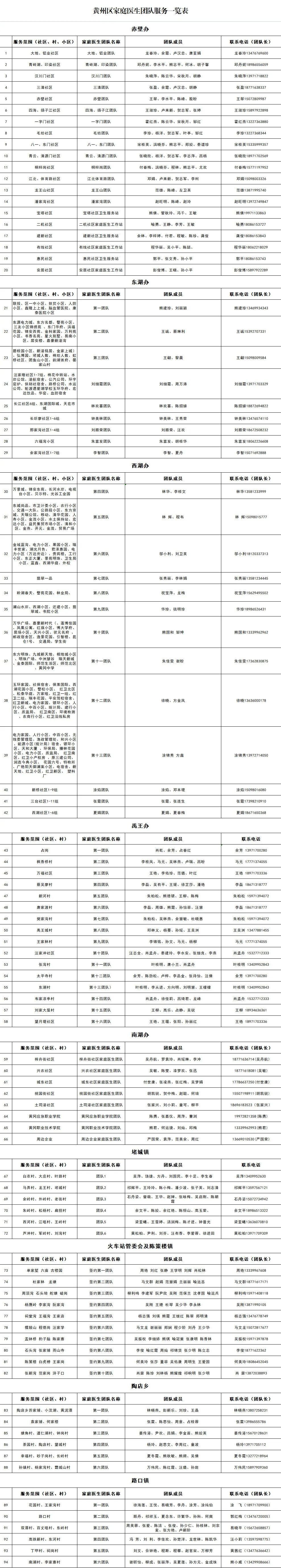 出现发热、咳嗽等症状居家治疗不见好转怎么办?大家不必着急跑医院,家庭医生团队就在身边。 为解决好疫情期间群众看病就医问题,黄州区卫健系统90余支家庭医生团队竭诚为群众提供就诊咨询服务。 居民出现发热、咳嗽等不适症状需要寻医问诊时,可通过电话联系辖区家庭医生团队寻求帮助,也可在家庭医生团队的指导下,选择居住地附近的社区卫生服务中心或乡镇卫生院就诊,必要时可以转诊到上级医院就诊。 遇有紧急情况,应及时拨打120急救电话。 附:黄州区家庭医生团队一览表