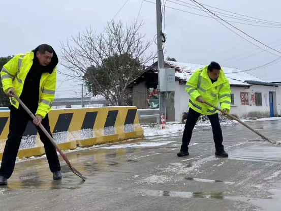 越是恶劣天气越坚守岗位,黎明时分,区农村公路事业发展中心迅速启动农村公路应急保畅预案,中心支部书记张水华组织应急抢险突击队和公益性岗位人员近40人,携带应急皮卡5辆、撒盐机3部、扫雪机一台,以及融雪剂和防滑料近10吨。分四路奔赴全区各乡镇巡查排险,对县乡道和通村主干道上的平交路口、急弯陡坡、临水临崖、桥梁涵洞和视距不良路段通过抛撒融雪剂、防滑料铲冰除雪,并设立安全通行警示标志,消除安全通行隐患,确保极端天气下农村公路安全畅通,沿线群众安畅出行。