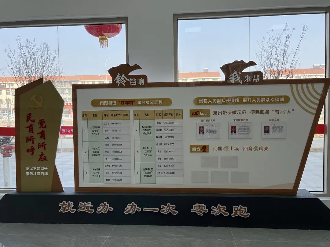 “民有所呼、我有所应”。街道坚持抓党建促基层治理能力提升,创新推行“服务铃响、党员来帮”服务模式,建立52人的“红邻铛”帮代办服务队伍,积极动员市直、区直党员干部下沉社区报到领岗、履责服务,为有需要的企业、群众上门开展“红邻铛”帮代办服务。在南湖街道和各社区便民服务中心的显眼位置,便民服务事项和“红邻铛”服务员的联系方式都被公示出来,一目了然。
