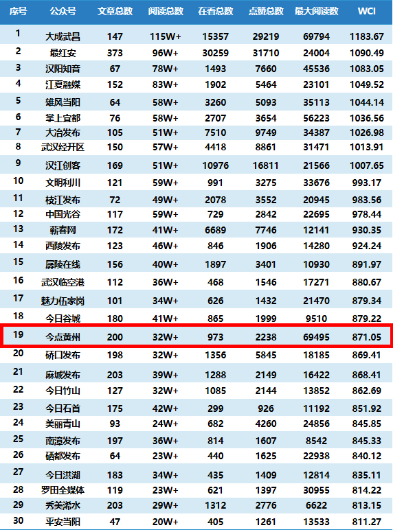 湖北区县微信排行榜2023年3月榜单发布“今点黄州”微信公众号在湖北区县政务部门微信中成功进入20强,排名第19名排名上升8位快随小编一起来看看吧