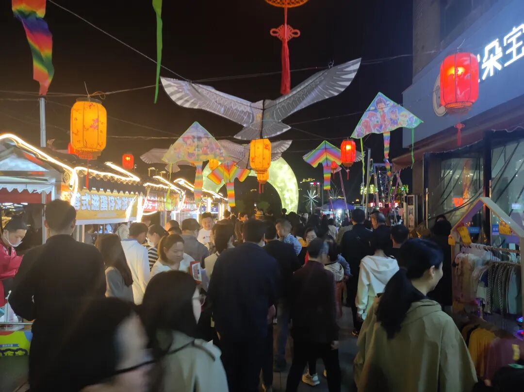 除了各类风味小吃店、文创市集、非遗作品馆,纸鸢文化夜市也是精彩纷呈,前来游玩的市民应接不暇。“五彩的蝴蝶、橙黄的雄鹰、各类独特的纹路装饰”幸福的色彩跃然纸上,奇幻的想象由此打开,形态各异,新潮夜市与古风古韵相互碰撞,活灵活现的纸鸢描绘出一个个五彩斑斓的夜晚。