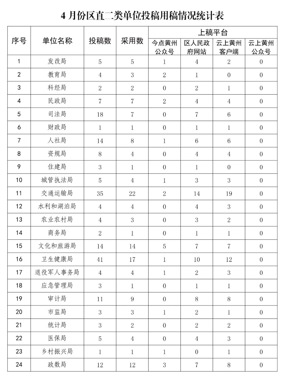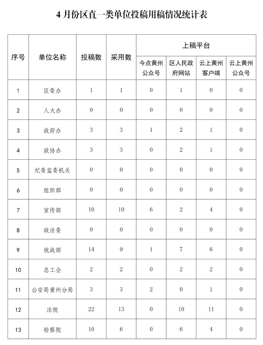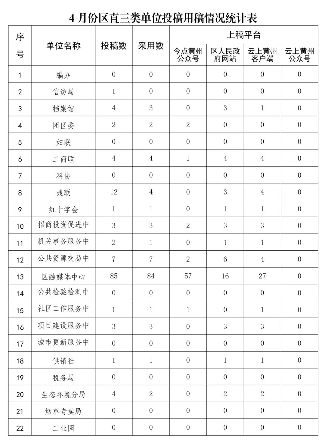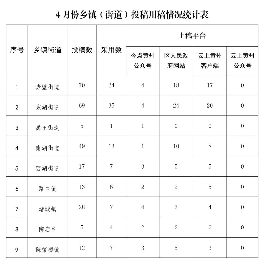 为准确掌握全区各乡镇街道、区直各单位新闻宣传工作情况,加强通讯员队伍建设,督促进一步做好新闻宣传工作,现将4月份各地各单位在区融媒体中心旗下平台新闻宣传供稿情况进行通报。