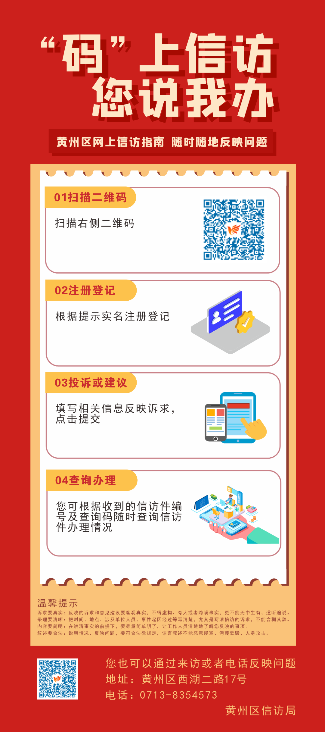 在《信访工作条例》实施一周年之际,黄州区坚持以人民为中心,深入贯彻落实《信访工作条例》,积极畅通网上信访渠道,正式推出——您说我办,信访“码上行”网上信访,积极打造畅通便捷、务实高效的信访渠道,实现让数据多跑路,让群众少跑腿,打通信访服务“最后一厘米”。 现通过扫码即可一键反映诉求,诉求通过智慧信访信息系统转送办理,并能随时随地查看办理进度。 具体操作方法如下: