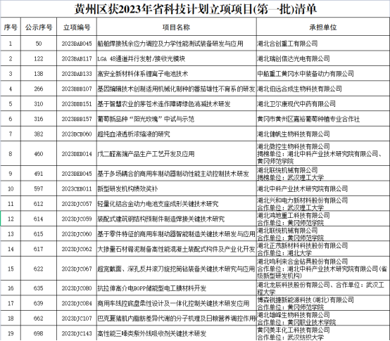 近日,湖北省科学技术厅公布了“2023年省科技计划项目(第一批)”专项支持名单。其中,黄州区19家企业获批省级(第一批)科技计划项目,争取省级项目资金980万元。