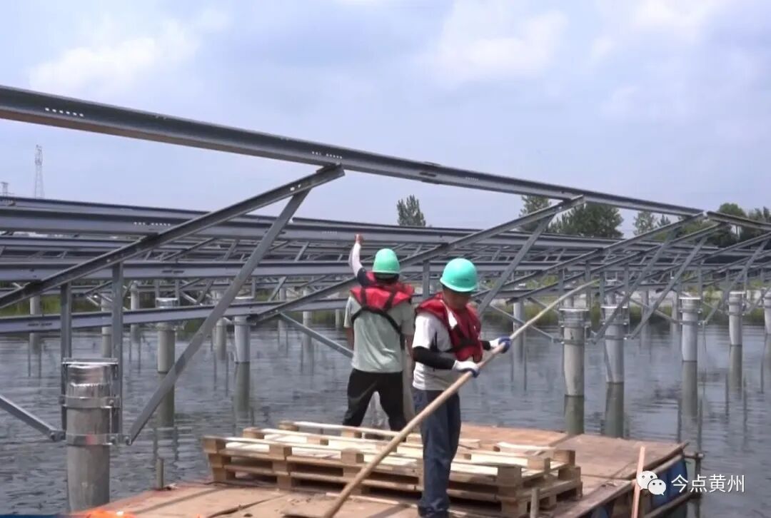 近日,在陈策楼光伏项目施工现场,工人们头顶烈日,全身心投入到工作中,有的在水面打桩抱桩作业、有的在安装太阳能板、有的在进行逆变器安装,建设现场一派热火朝天的施工景象。