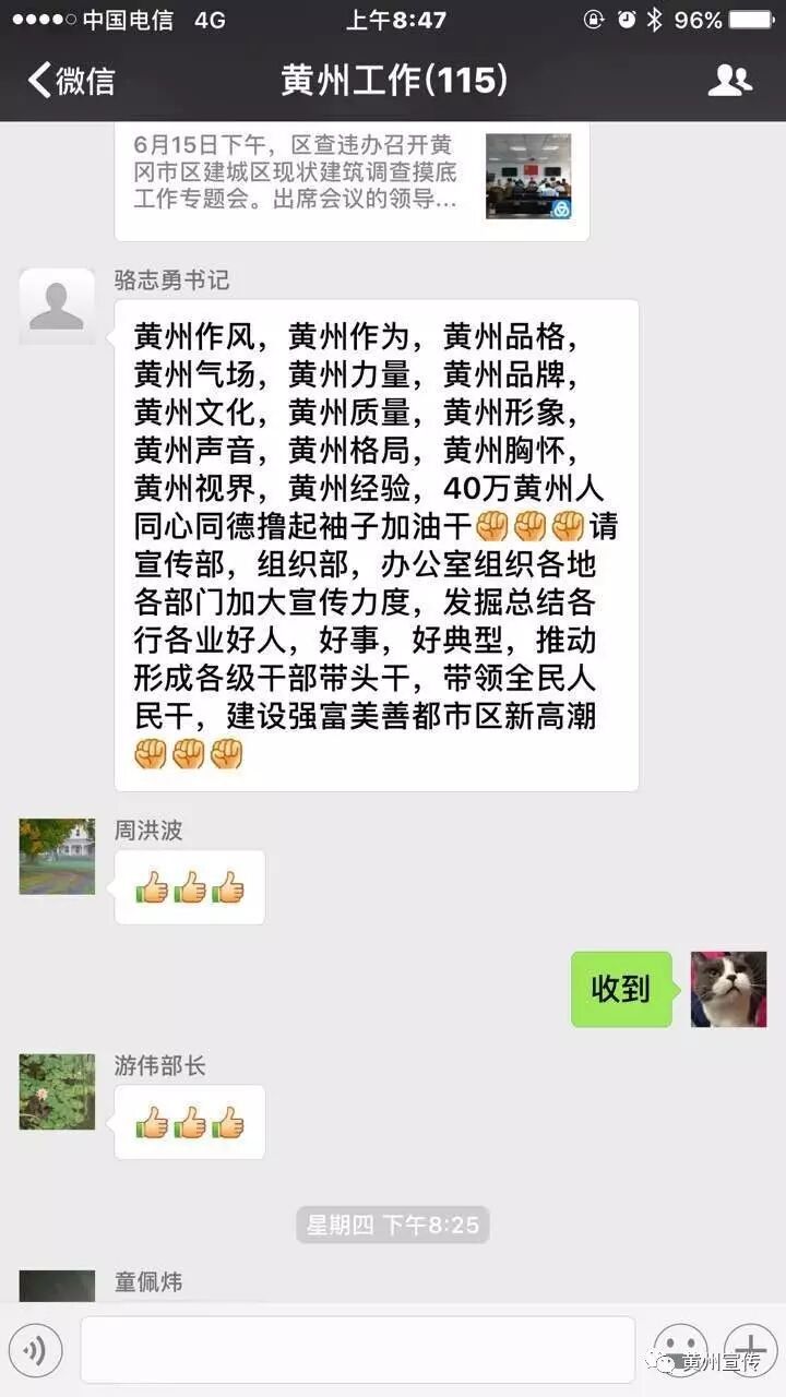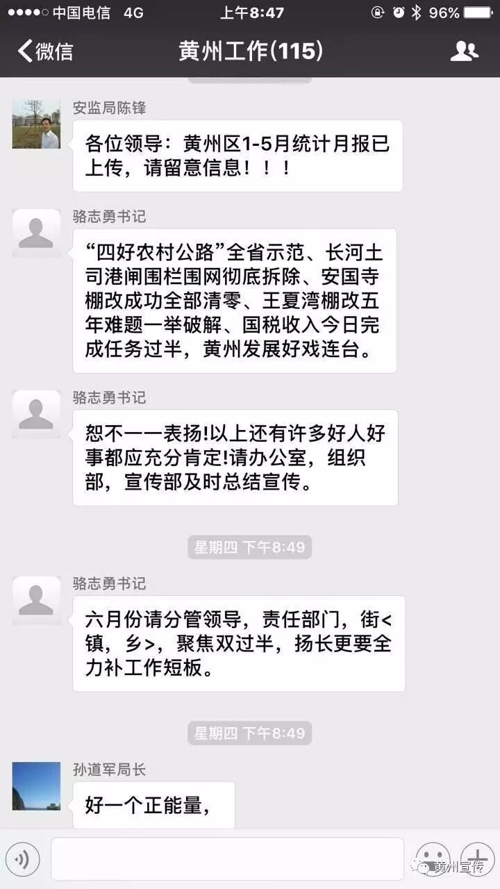 区长胡凯点赞:工作群建立时间很短,已成为相互交流、比学赶超、促进发展的平台。从大家的辛勤工作和业绩中感悟到黄州作为、黄州担当、黄州精神。希望大家保持发展势头、全力攻坚,全面完成各项目标任务。