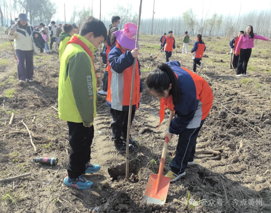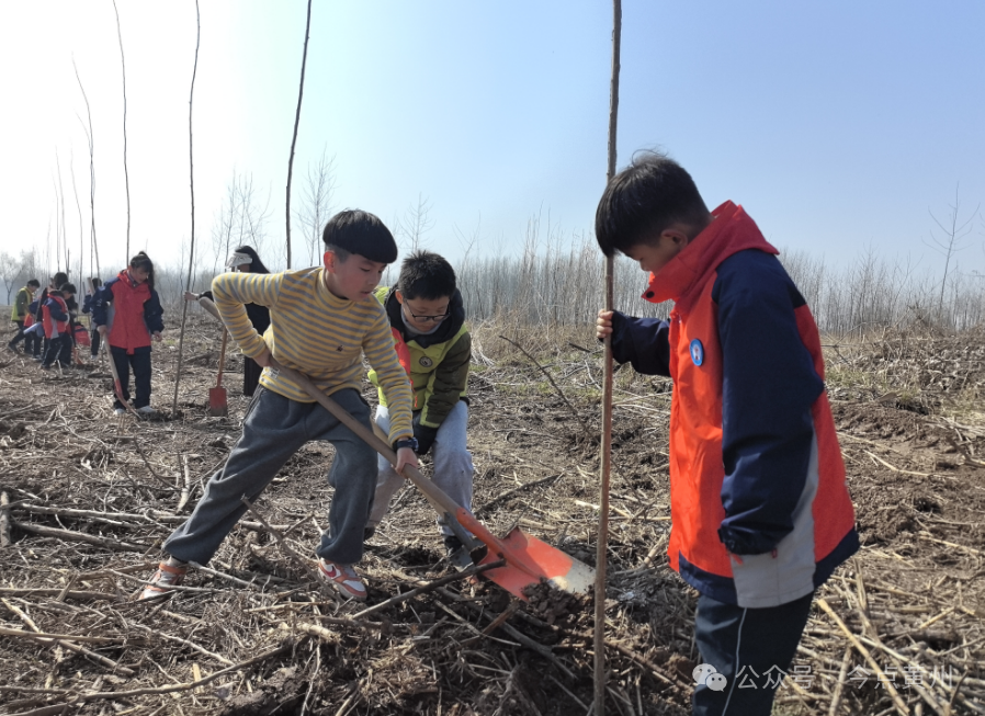 在义务植树活动现场,学生们三人一组,分工协作,分区包片,挽起袖子,脚踩黄泥,干劲十足。挥锹培土、修整树坑、扶苗填坑、提桶浇水,有条不紊地完成每一道植树工序。