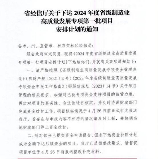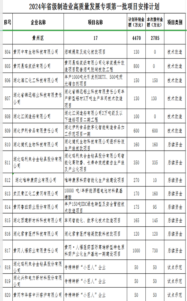 近日,湖北省经济和信息化厅发布《2024年度省级制造业高质量发展专项第一批项目安排计划》,黄冈市有70家企业获得省级高质量发展专项奖补资金,其中,市区黄冈中有生物科技有限公司、黄冈晨鸣浆纸、湖北海汇化工科技有限公司等17家企业成功入选。