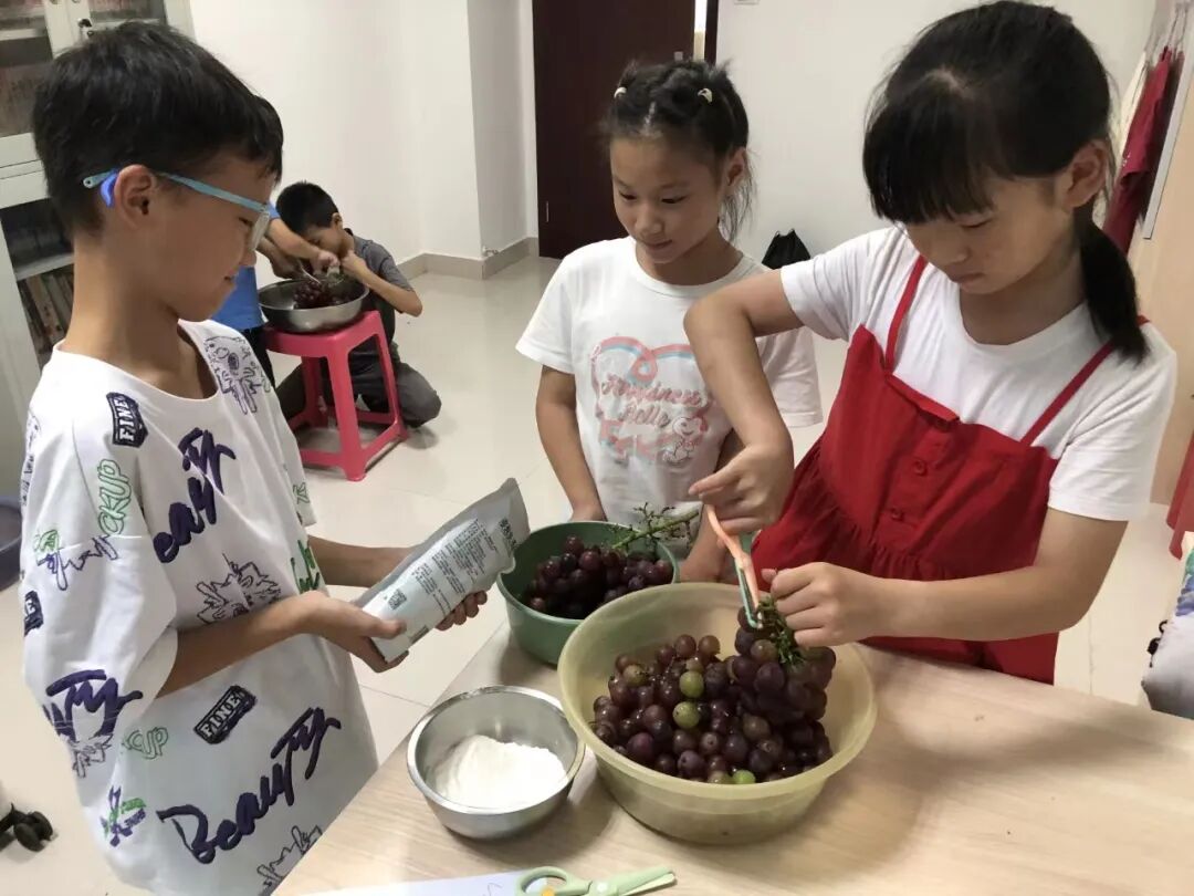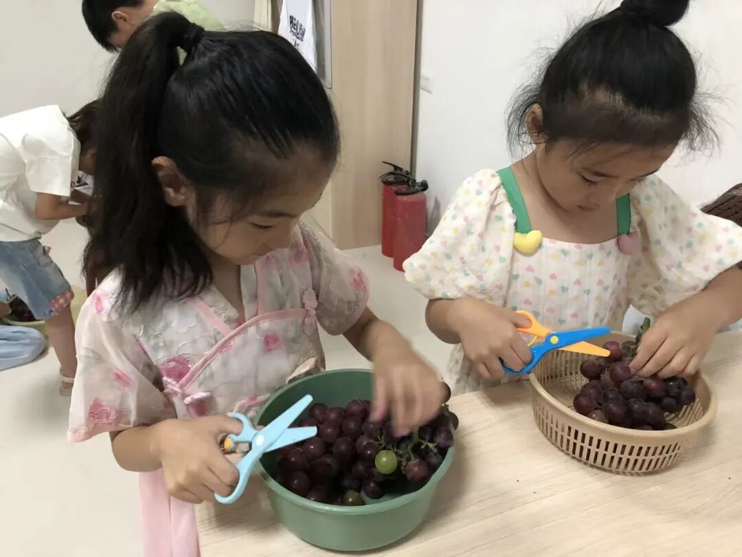有同学提问:“为什么不能直接把葡萄摘下呢?”面对孩子们的疑惑,志愿者耐心解答道:“如果将葡萄直接摘掉,葡萄顶端果皮会发生破损,洗水果时果肉会被污染。”在水中加入少许淀粉静置后,志愿者和孩子们共同将葡萄洗净。