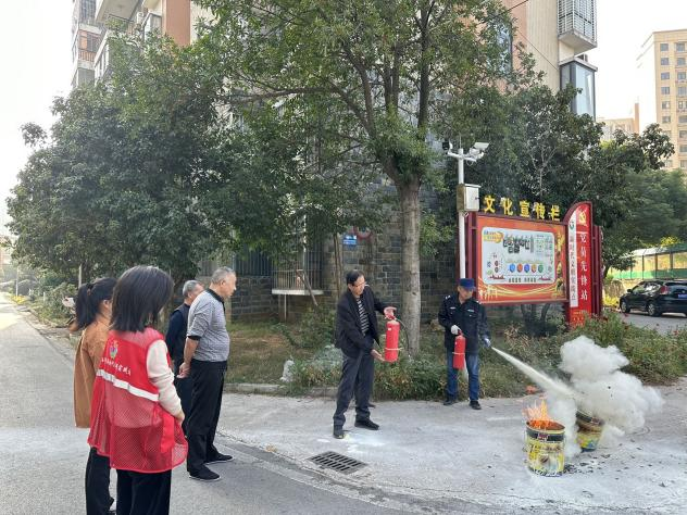开展消防演练。在演练中社区工作人员为大家讲解了灭火器的正确使用方法和注意事项,传授灭火器的“一摇、二拔、三瞄、四压”的操作要领,并现场示范灭火器的使用程序。现场工作人员、居民等先后用干粉灭火器进行了灭火操作,在实战操作中,真正做到将理论强化于心,将技能熟练于行。进一步增强了辖区居民对消防工作重要性的认识,提高大家的消防知识水平和自防自救能力,营造人人“知风险、能防范、懂逃生”的消防安全氛围。