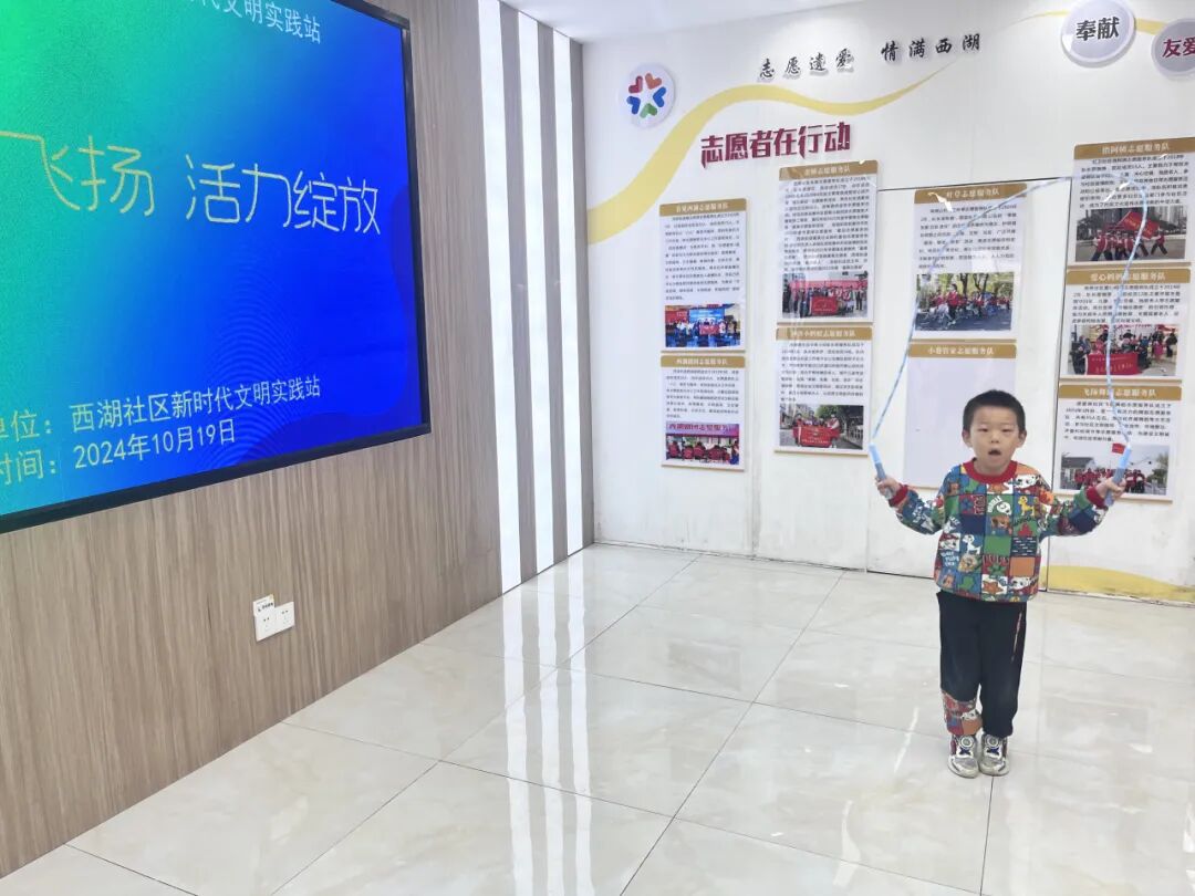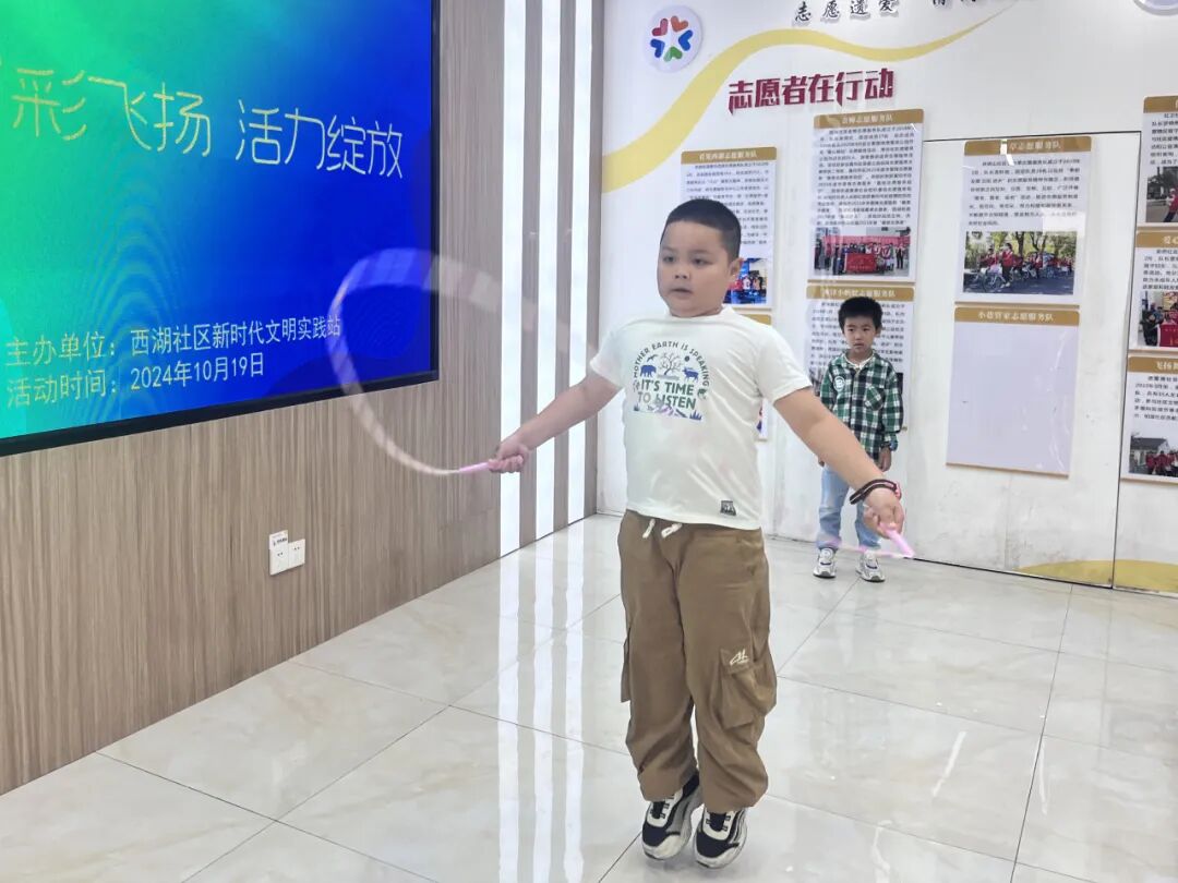 “一分钟倒计时,开始!”随着志愿者的一声令下,小朋友们快速甩动绳子,随着双臂摇绳的节奏不停地跳着,围观的家长和小朋友们在一旁帮忙计数、加油呐喊,每个人的脸上都洋溢着快乐的笑容,活动现场十分热烈,呈现出积极向上、健康阳光的氛围。