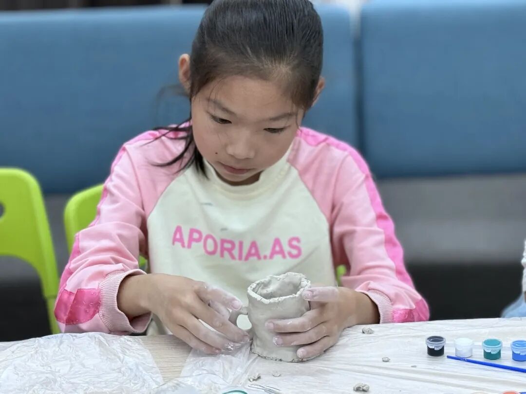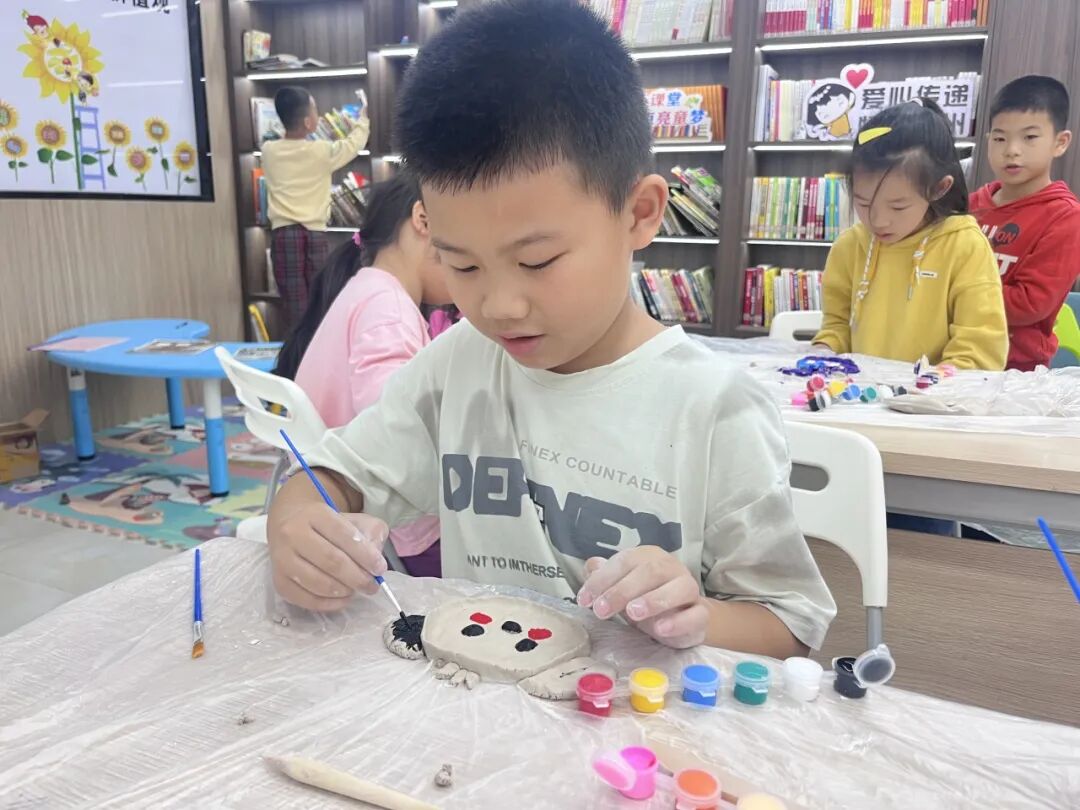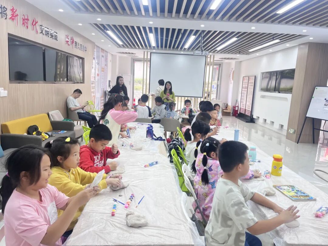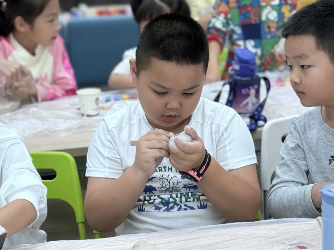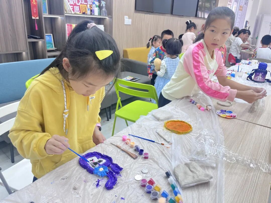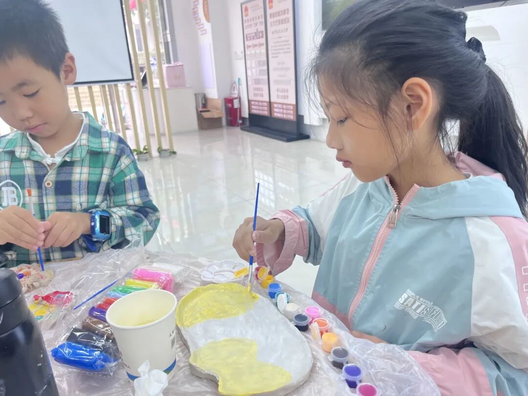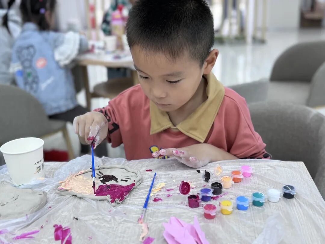 在手工环节,志愿者为小朋友们分发陶泥,解说捏陶泥的注意事项,便到了“小艺术家们”自由创作的时刻了。大家以揉、搓、压、捏、拍、打等方式进行塑型,最后再进行上色。很快,陶泥在孩子们手中变成一件件形态各异、富有创意的陶艺作品。大家一边做,一边互相交流着自己的创意,“看我做的小兔子!”“我做的是可爱的猫咪餐盘!”欢声笑语此起彼伏。