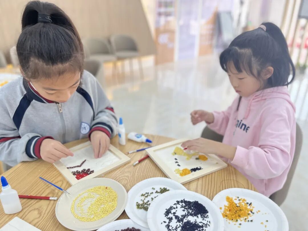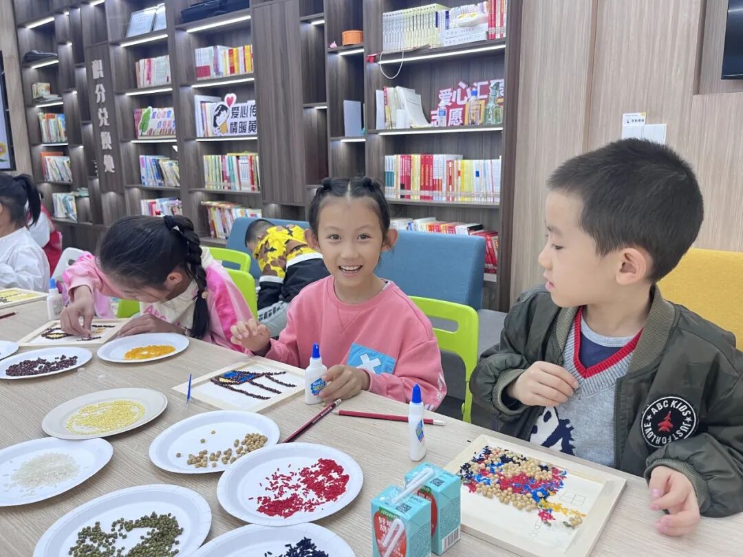在五谷画的手工制作环节,志愿者首先向小朋友讲解了节约粮食的重要性,倡导大家养成科学合理的饮食习惯,减少“舌尖上的浪费”。随后,志愿者为孩子们分发材料,讲解五谷画制作过程中的要点:“先简单勾勒一下线条,再用胶水涂满要进行粘贴的区域。五谷的大小可以根据图案的设计来选,再用不同颜色的五谷将其贴满。”在志愿者的指导下,孩子们尽情发挥想象力,以粘、贴、拼的方式,将红豆、绿豆、黄豆、大米、小米、黑米等不同种类五彩缤纷的五谷,变成一幅幅立体而生动的精美作品,寓意着丰收与吉祥。大家看着自己的作品,脸上洋溢着自豪和喜悦。