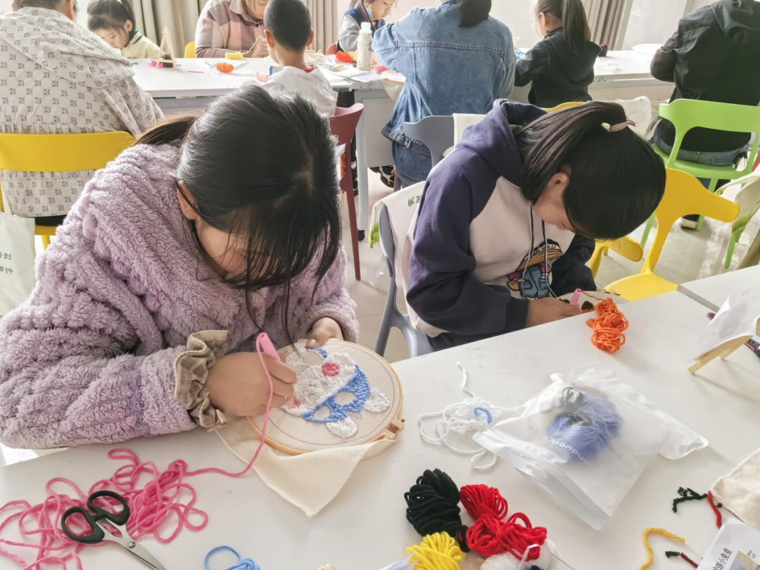 随后,志愿者给大家分发了材料包,带领孩子们用穿好毛线的空心针在油画布框上一戳一戳地移动。一团团五颜六色的绣线,加上孩子们各自的无限创意,让每一个步骤都充满惊喜。她们一边戳着绣品、一边交流经验,不一会儿,大家很快掌握了戳戳绣的要领,制作越来越得心应手。