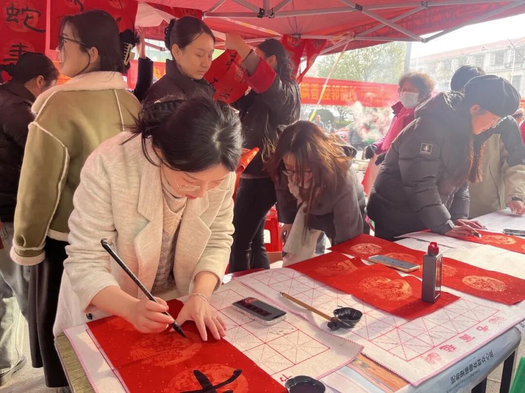 来自黄冈师范学院美术学院、农耕博物馆的书法老师及书法爱好者现场挥笔泼墨,写春联和福字,将新春祝福凝聚在笔尖,用诚意满满的“文化年货”为居民送上新春佳节的美好祝福,迎来大批居民群众驻足围观,纷纷赞叹。“手写春联才更有年味!”居民拿着充满年味的春联、“福”字,脸上洋溢着幸福的笑容。