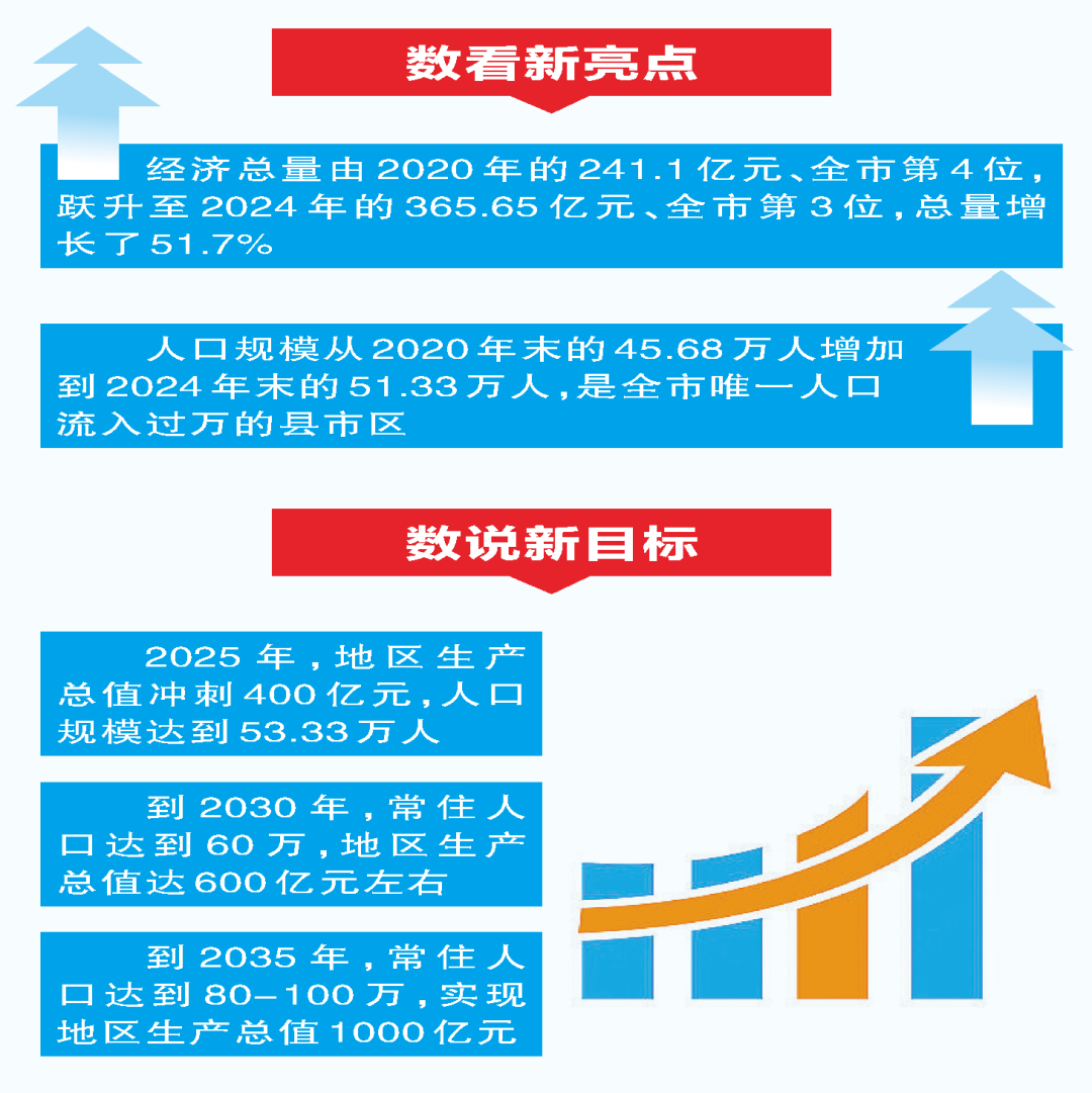 近五年来,黄州区经济总量由2020年的241.1亿元、全市第4位,跃升至2024年的365.65亿元、全市第3位,总量增长了51.7%,人口规模从2020年末的45.68万人增加到2024年末的51.33万人,是全市唯一人口流入过万的县市区。市区初步形成了以光电子信息、生命健康、智能制造为主导和以现代服务业、农产品深加工为基础的“3+2”现代产业体系。这些为推进主城崛起奠定了坚实的基础。