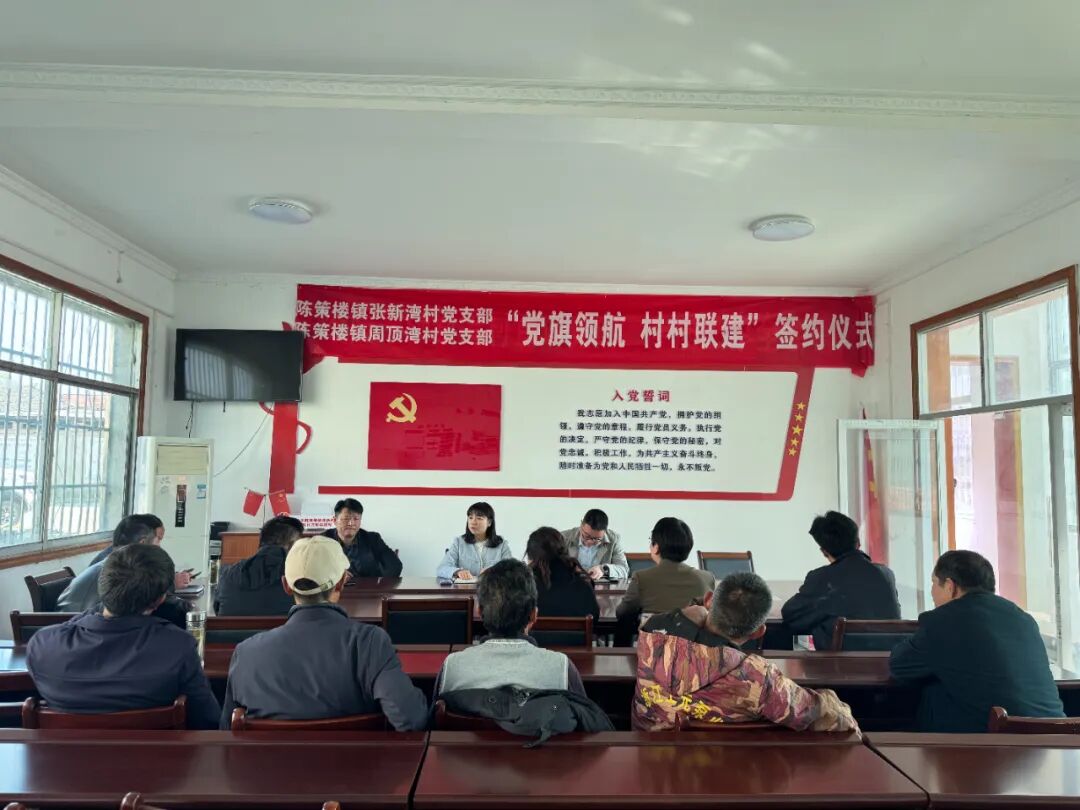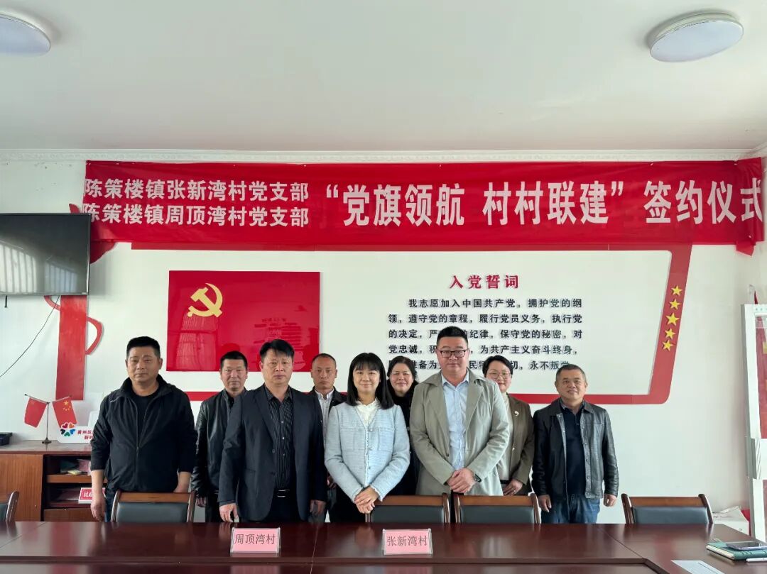 4月3日,陈策楼镇张新湾村、周顶湾村“党旗领航·村村联建”结对签约仪式在张新湾村成功举行,张新湾村、周顶湾村“两委”干部及部分党员代表参加仪式。