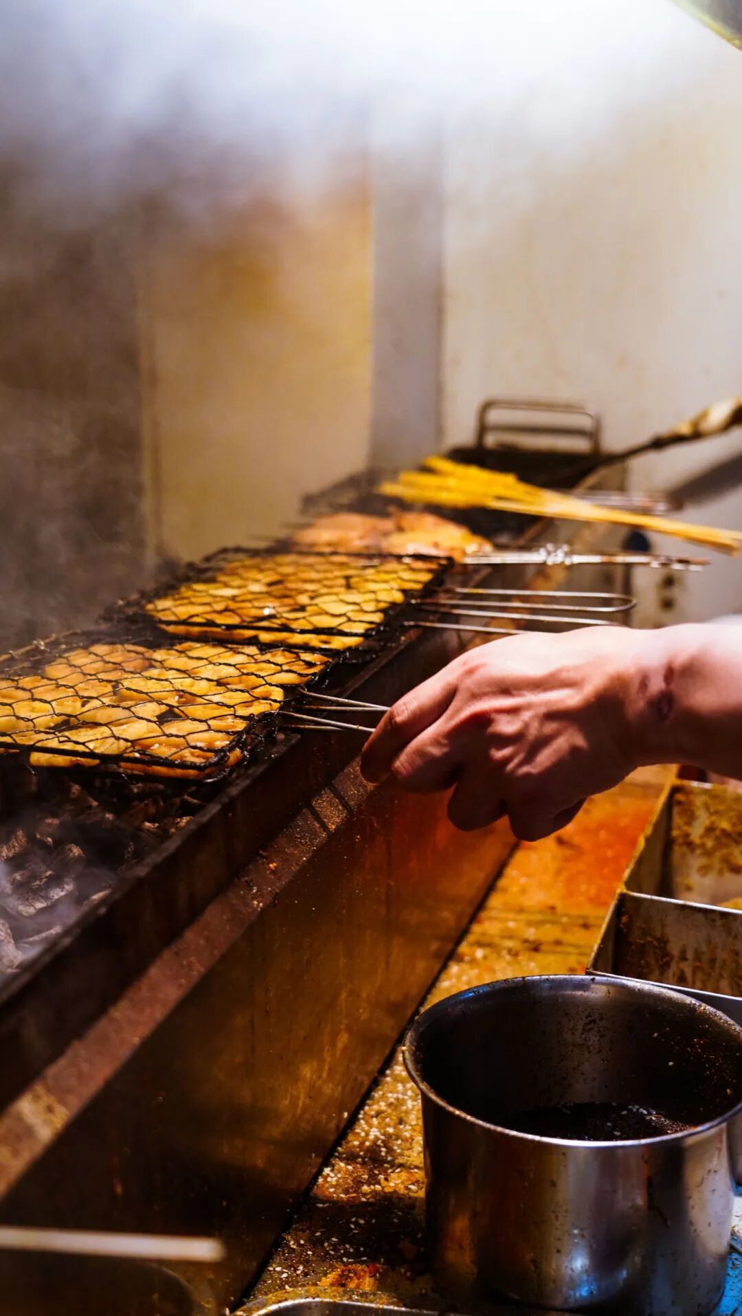 🍢烧烤摊上,炭火熊熊,肉串在烤架上滋滋作响,撒上一把孜然辣椒面,瞬间香气四溢;