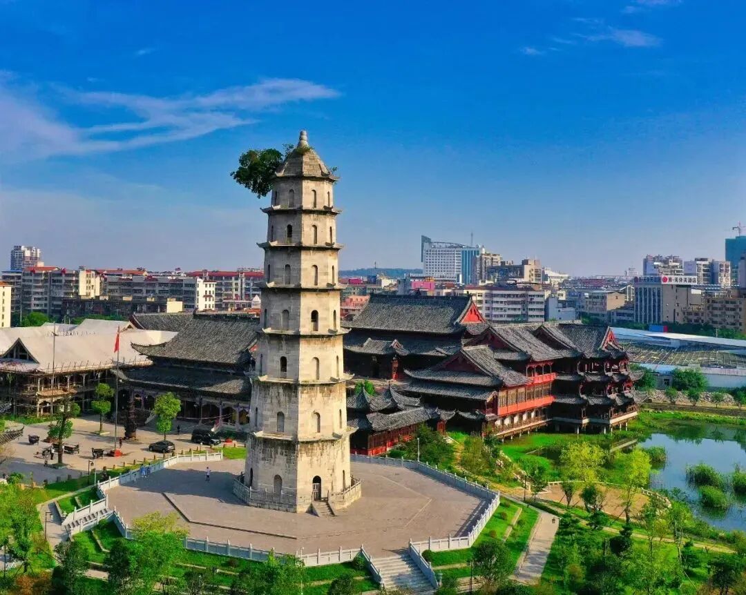 「青云塔」,又名文峰塔,因塔上有碑匾石刻“青云直上”和“全楚文峰”而得名。大叶朴树生于青云塔顶,主干三米有余,离地数十米,无土无泥,根深塔内,久涸不枯。