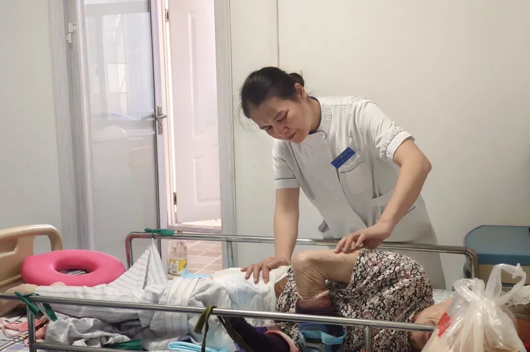 一次巡房时,87岁的张爷爷因为便秘,脸涨得通红,捂着肚子直哼哼。王飞燕戴上手套,俯身在床边,用手帮助其排便,用温水帮老人擦净身体,又蹲下来揉了揉老人的肚子,“现在舒服点了吧?”老人虚弱地点头,拉着她的手不肯放。