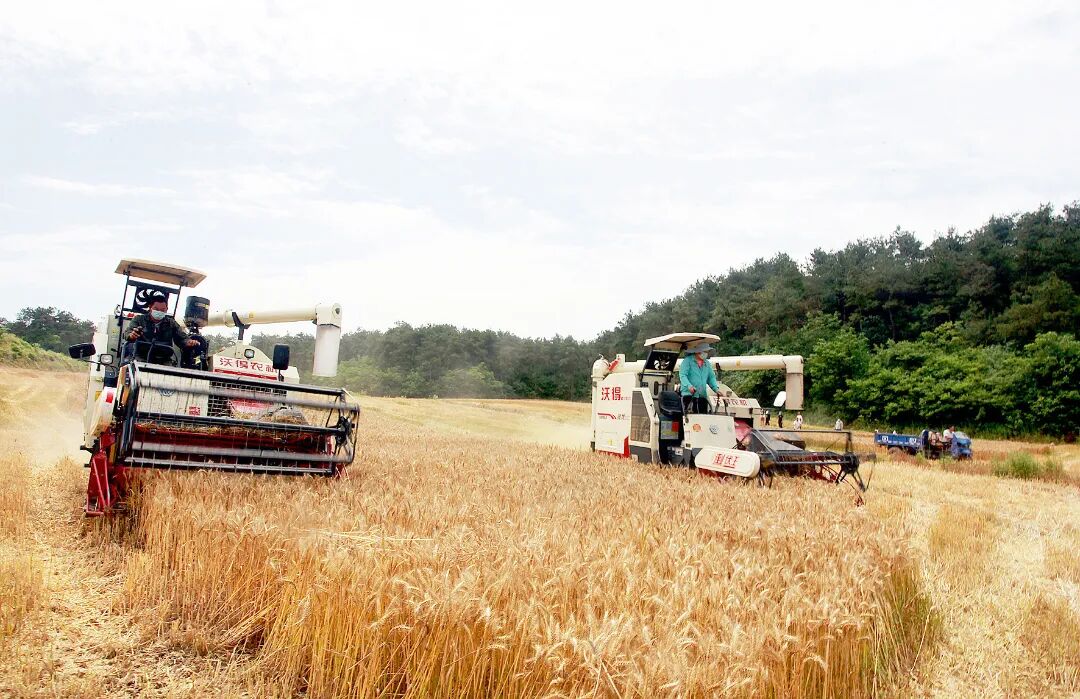 竹溪县中峰镇万亩稻田披上金黄盛装,收割机开足马力,往复穿梭,收割、脱粒、装车一气呵成。
