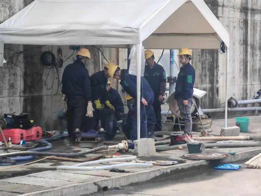 只见几十名身着蓝色工作服