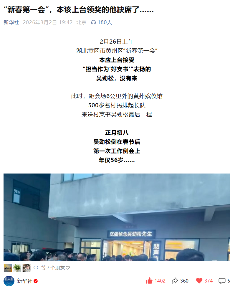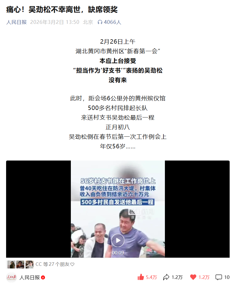 近日,黄州“好支书”吴劲松的感人事迹实现人民日报、新华社客户端等央级平台同天重磅刊发,取得了全网综合热度超千万次、点赞量超20万、留言超10万条的传播效果。一位默默无闻的村支书,为何能引发如此广泛的共鸣?其背后的宣传实践,为我们做好新时代基层典型宣传工作提供了深刻的启示。