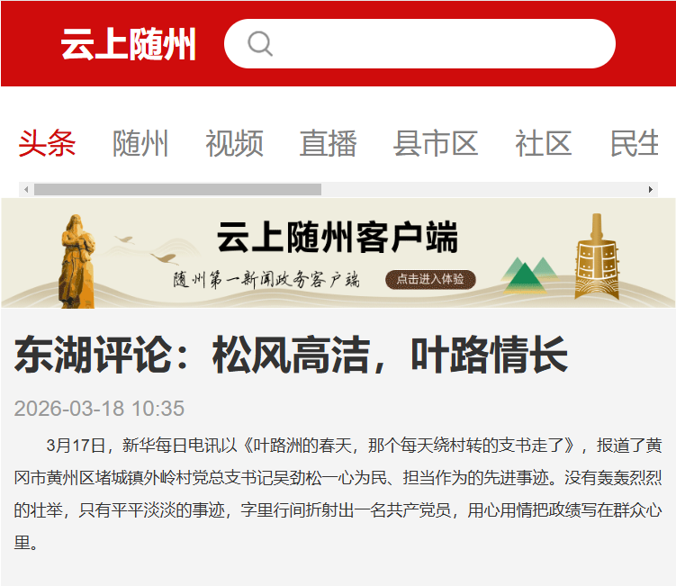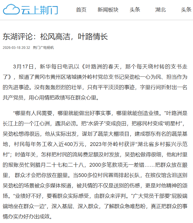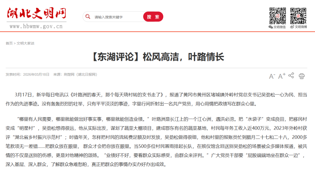 3月17日,新华每日电讯以《新华每日电讯 新华网| 叶路洲的春天,那个每天绕村转的支书走了》,报道了黄冈市黄州区堵城镇外岭村党总支书记吴劲松一心为民、担当作为的先进事迹。没有轰轰烈烈的壮举,只有平平淡淡的事迹,字里行间折射出一名共产党员,用心用情把政绩写在群众心里。