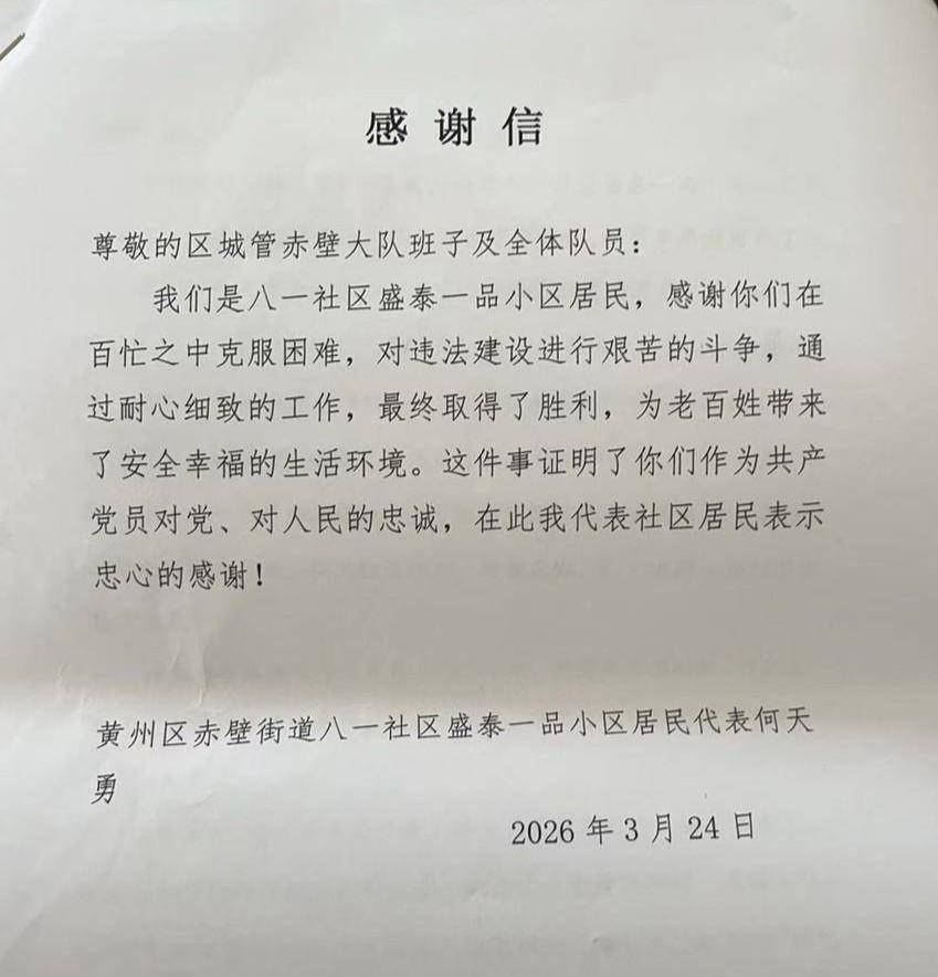 “太感谢了!困扰我们这么久的安全隐患终于解决了,这下心里踏实多了!”近日,黄州盛泰一品小区居民何天勇握着黄州区城管赤壁大队执法人员的手,激动地将一面印着“怀爱民之心,办利民之事”的锦旗和一封感谢信送到大队。赤壁大队大队长周亮、副书记夏建桥代表大队接受了这份特殊的“点赞”。