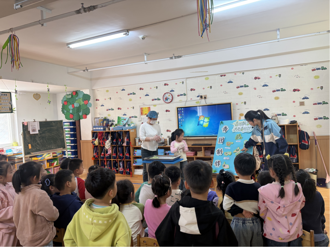 活动伊始,幼儿园老师为孩子们精心制作了青团相关知识科普展板。展板以图文并茂的形式,清晰呈现了青团的由来、清明相关民俗文化以及完整的制作流程,画面生动、内容浅显易懂,十分贴合幼儿的认知特点。在老师的带领下,孩子们围站在展板前,认真聆听讲解,仔细观察每一个制作步骤,主动分享自己的发现,一步步了解青团从食材加工到成品出炉的全过程,在直观学习中感受传统美食蕴含的文化趣味,收获了实用的民俗小知识。