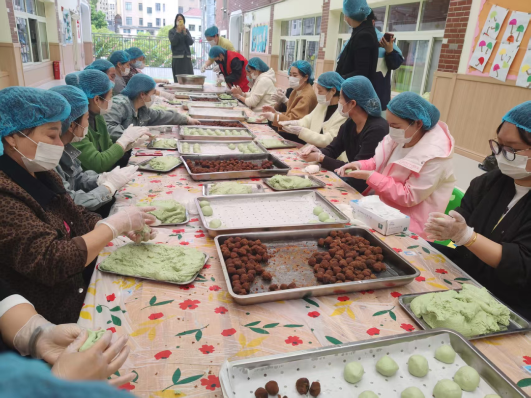 活动现场氛围温馨和睦,家长们相互交流制作技巧,欢声笑语与淡淡的艾草清香交织在一起,勾勒出春日里温暖的家园画卷。一个个精致的青团,既承载着传统民俗的韵味,也凝聚着家园携手的温情。